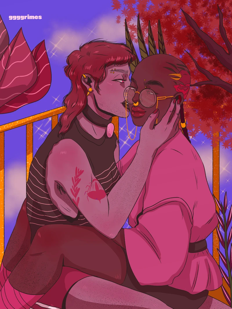 我主要想聚焦的是有色人種的酷兒們,想表現我們快樂地生活著的模樣。我也喜歡畫一些情色場景,因為你不會常在西方媒體上看見同志性愛,有色人種的同志更不用說,所以我愛畫讓酷兒粉絲有共鳴的東西。在螢幕上能看到兩個順性別且同性別的人接吻已經很幸運了,所以我自己畫任何指定性別的女性向者進行火辣性愛,會覺得很過癮。我自己屬於非二元性別認同的人,出生時的指定性別則是女生,所以這些插畫不論是激情或不激情的,都對我很重要。如果在成長過程中,能看到更多像我這樣的酷兒人物,對我的情緒發展應該會幫助不少。