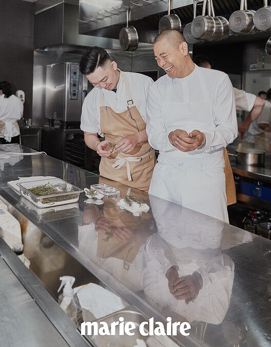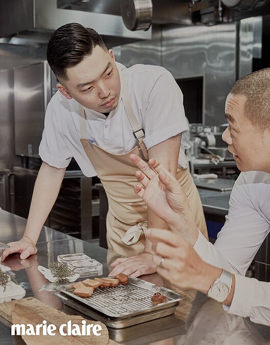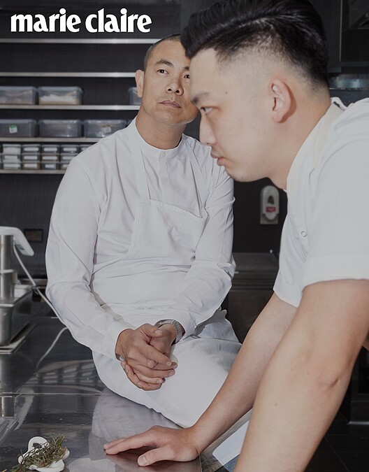 站在RAW的廚房裡,兩位身高超過一百八的主廚,正對著眼前的食材比手畫腳,一個看似淡定、游刃有餘,另一個小心謹慎、專注地思考問題,但是從旁人來看都有個共同點,那就是散發著對料理的執著,在轉身就會相撞的廚房裡,他們兜起了所有人的連結,像是具有吸力的宇宙核心。當畫面轉回討論食材的現場,想當然,淡定的那位,必是見過大風大浪的江振誠,而新任主廚王奕翔,則是不斷提出菜單排列的新方案,等著江振誠一句肯定的「OK」。