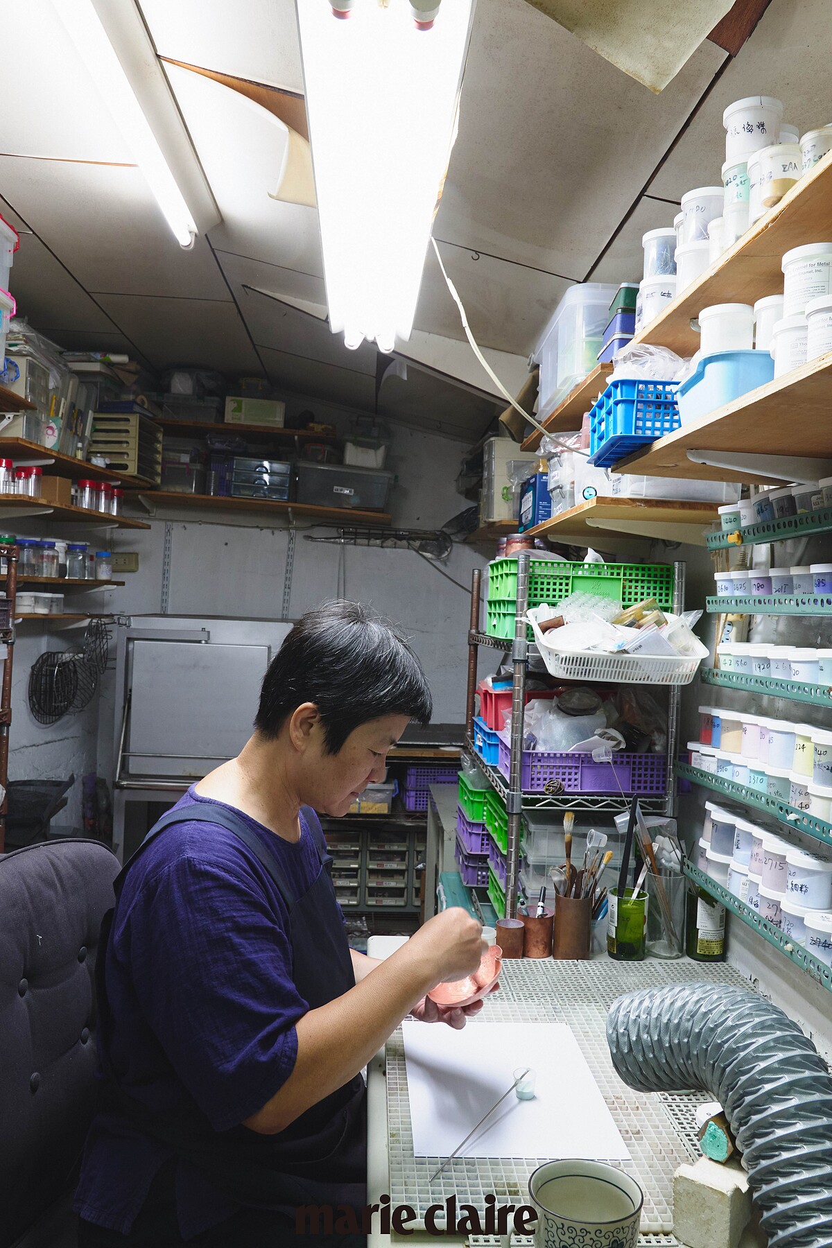 在金工課上接觸到琺瑯這個項目時,並不是一見鍾情的,燕華老師第一印象反而是「好麻煩啊」。琺瑯的製作過程光是備料就花費許多時間,要先將各種顏色進行研磨淘洗,在敲打成形後的金屬胚仔細地上料,接著是進窯燒製、重複疊色再燒製的反覆過程,最後再進行拋光的步驟。