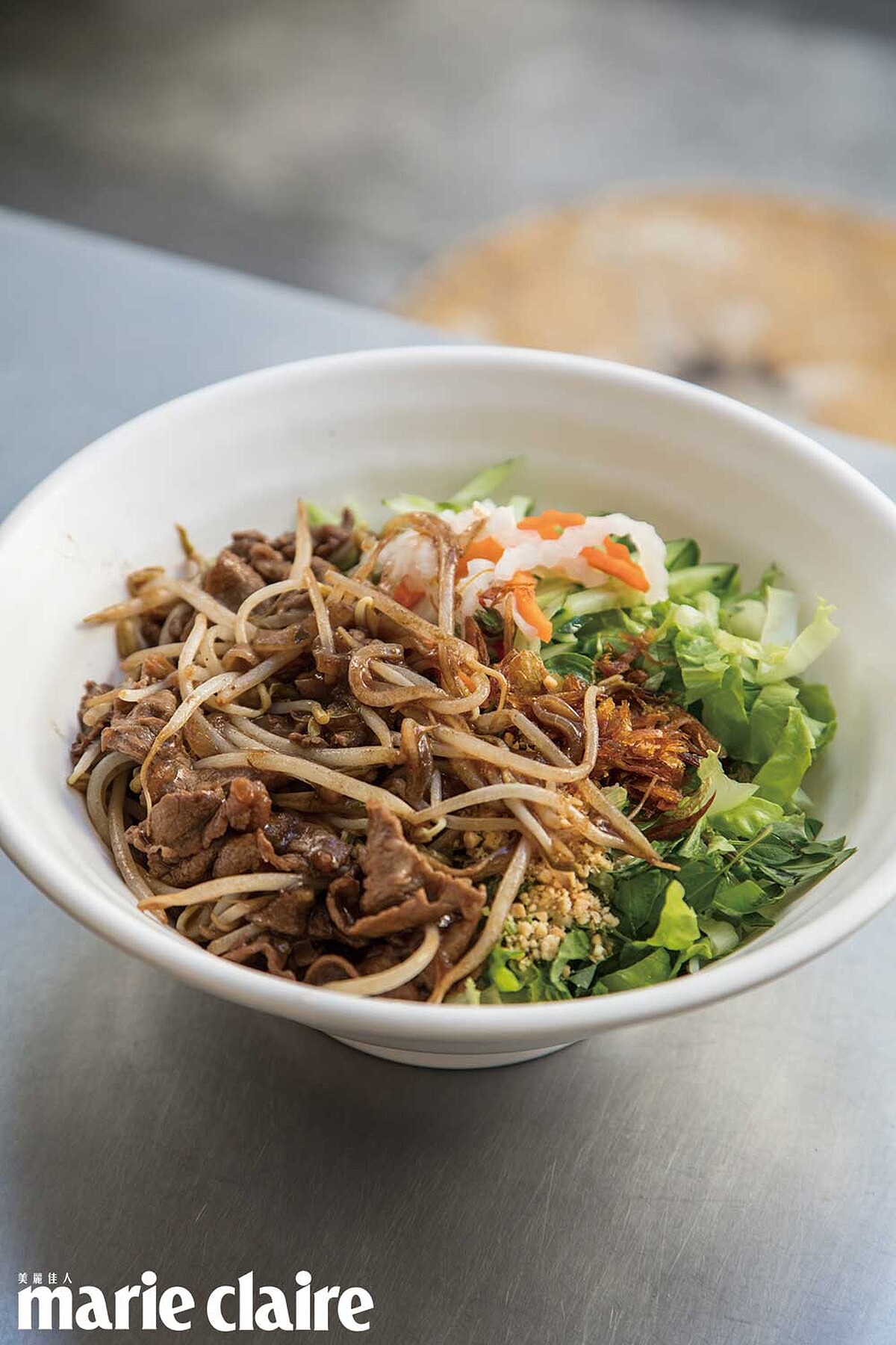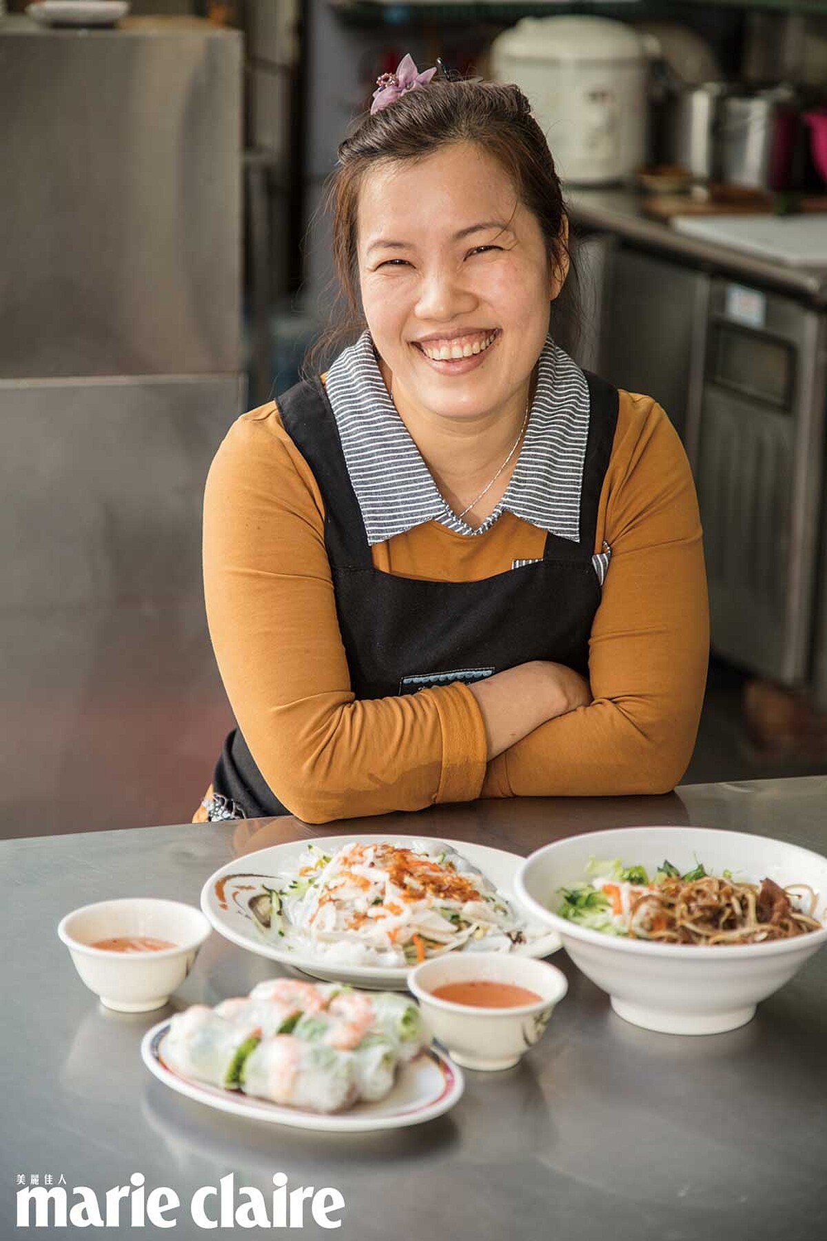 「越南菜用很多檸檬,但是成本太高,我又不想用罐頭,就改用醋。台灣人口味比較清淡,台灣醋、越南醋都太濃,最後用泰國醋,味道最剛好」,調味的香料和醬料來自東南亞,蔬菜、海鮮、肉品則都採用台灣生鮮食材,鍋貼店一個月內就收攤,改賣越式料理。她端出的「新台味」還不只這些,像附近的粵菜老闆教她「乾炒牛河」的牛肉炒法,她改以越式醬料快炒,連越南也沒有的炒牛肉乾拌河粉就此誕生在台灣,開店兩年後逐漸在婆婆媽媽最挑剔的菜市場內站穩腳跟,也打開知名度。