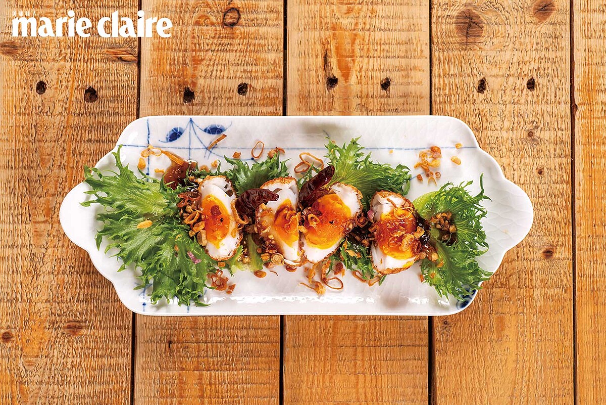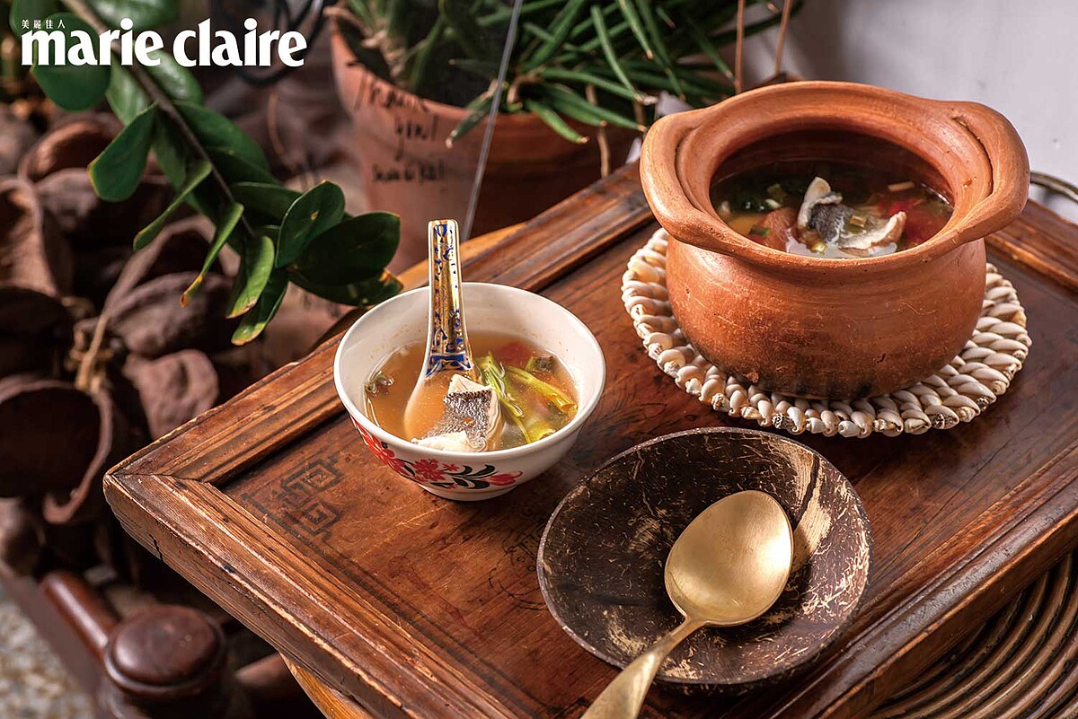 像桌上的湯品,並非有著南薑、香茅、檸檬葉等香料的「東央共」泰式酸辣湯,而是泰北地區的「酸魚湯」,鱸魚細緻,搭配鮮嫩的溫泉水耕空心菜,酸辣香氣自然芬芳;另外一道「女婿蛋」,則是半煎炸水煮蛋,再淋上酸甜醬汁,菜餚源於有個父親去找女兒,但女兒碰巧外出,手邊材料有限的女婿做出這道料理招待老丈人,岳丈吃了後眉開眼笑,延伸到現在,如果泰國男孩到喜歡的對象家中做這道料理,就是在求婚,「這樣求婚比較便宜」,阿泰哈哈大笑。