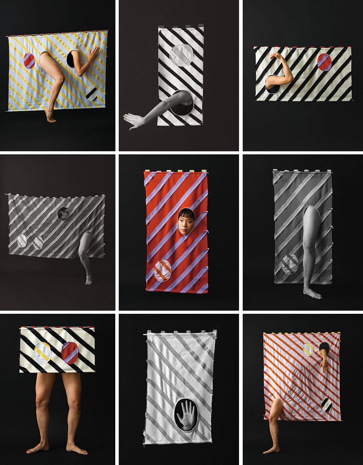 裝置作品「The Brilliant Shadow of The Canopy」,每一副旗幟都有上面都有一到兩個洞,象徵不同的文化與社會架構。拍照時,Can 隨機的疊加不同圖樣配置的旗幟在我身上,而我要試著在與旗幟上的圖樣互動的同時去伸展與平衡身體,Can 再趁那時候捕捉我扭曲肢體並試著支撐全身力量所展現出來的不適感。而當我們不斷更換旗幟的配置,我的身體姿態也不斷的解構和重組。