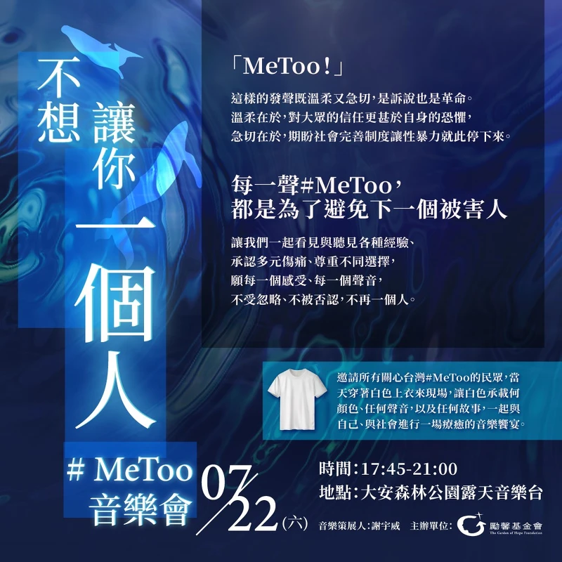 勵馨基金會期望能在#MeToo運動中帶來穩定的力量,今年7月22日在大安森林公園露天音樂台舉辦「不想讓你一個人,#MeToo」音樂會。活動將特別邀請各界關心台灣#MeToo運動的重量級嘉賓:知名女演員、同時也是「中華好好說話,學會」創辦人兼理事長賴佩霞、《人選之人》編劇簡莉穎;曾任促進轉型正義委員會委員,與中研院民族所副研究員彭仁郁;以及關心社會公義,總為大家帶來療癒能量的唐綺陽老師,一起促進不同族群的對話,並由致力性別平權的電視節目主持人鄒宗翰主持這場音樂會,為社會重新建立信任,為性別公義發聲。