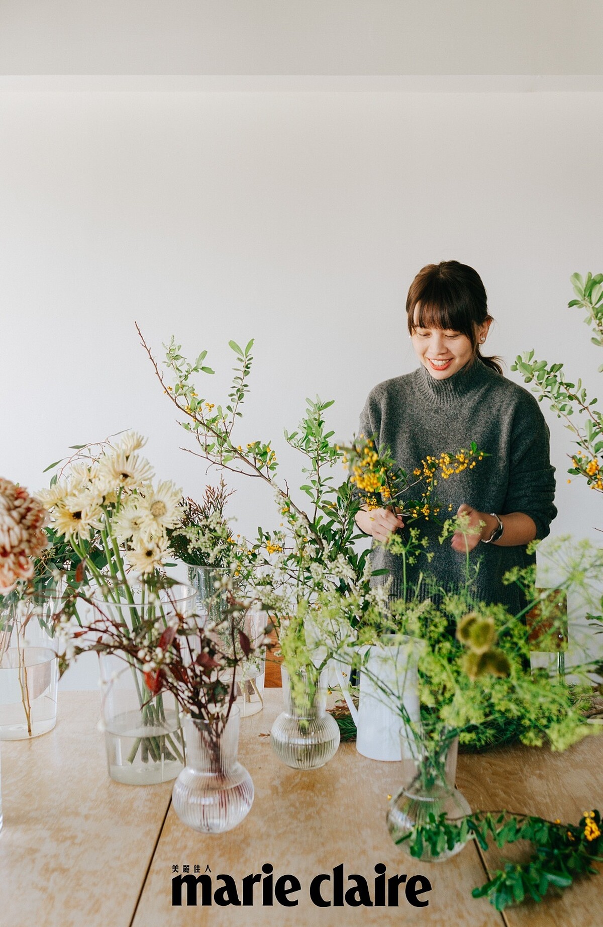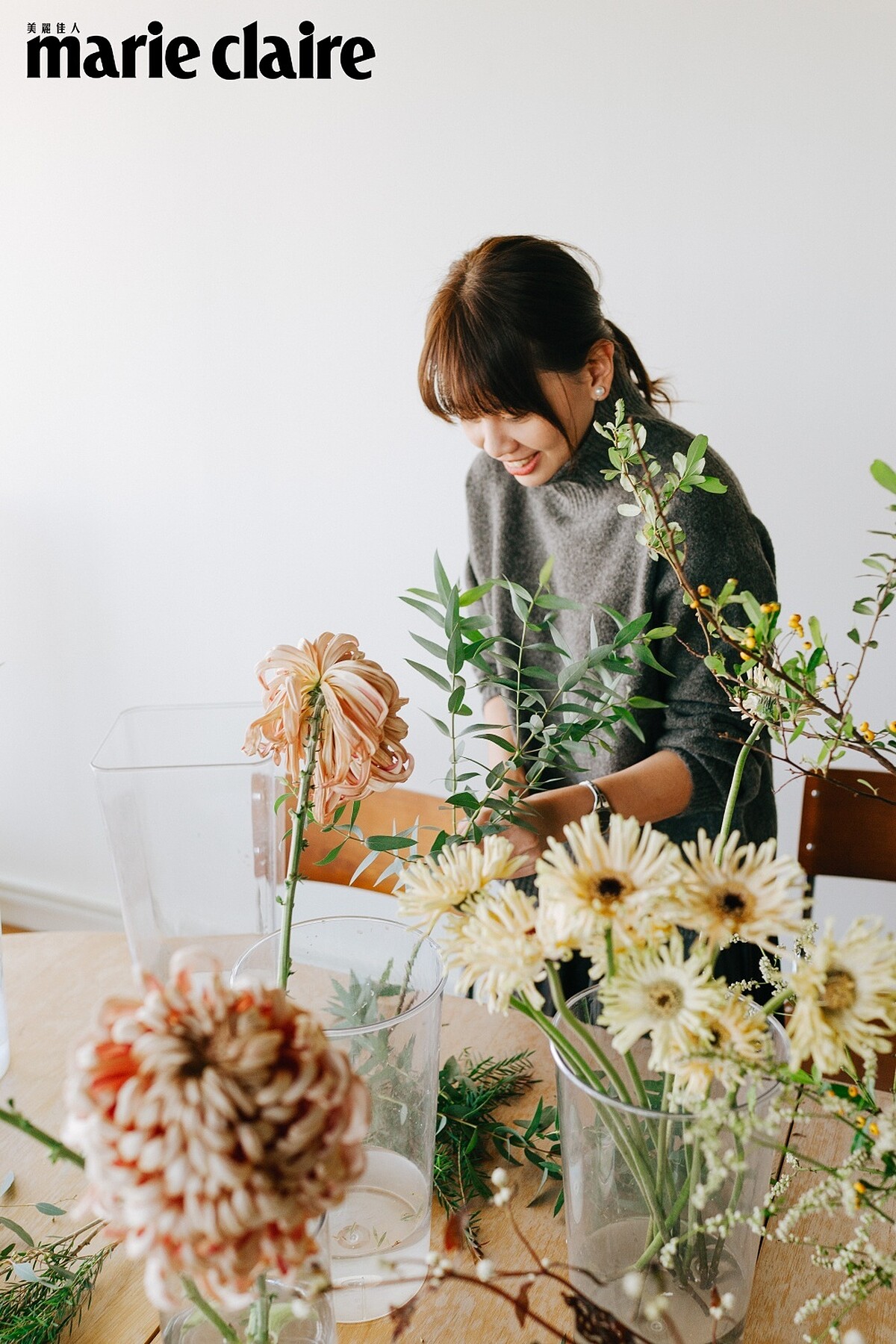 沐浴在陽光中整理花束,柯采岑安靜地沉浸在心流中,剔除葉子、修剪花腳、讓花朵層次錯落在手心,再緩緩繞成一浪漫的詩。柯采岑坦言原本不喜歡花,卻在習花過程得到不一樣的人生體驗,並且讓她在充斥各種資訊紛擾的世界中,找到能與自己對話的機會,並且梳理出一套看待世界的新方式。