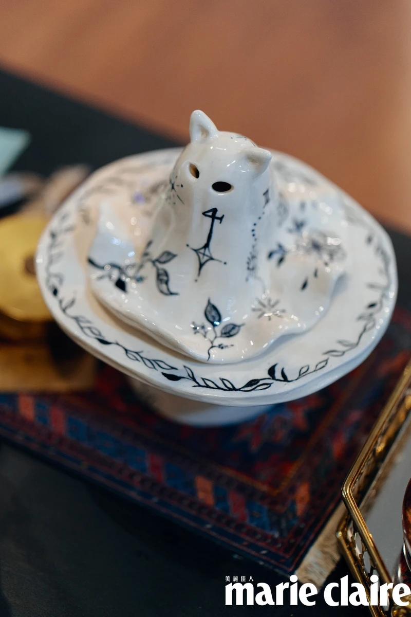 貓幽靈是我自己創作的陶藝品,做為燭台使用時,燭光會從貓眼中透出來,搭配舒服的蠟燭香氣,整個空間療癒感滿分。