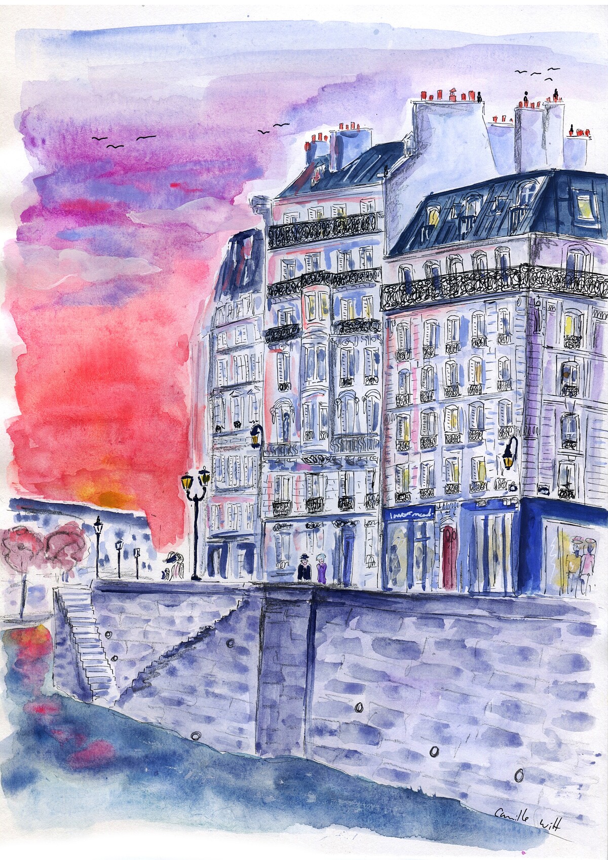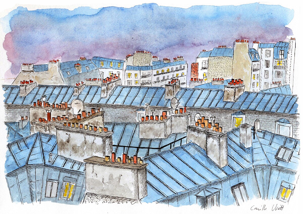 聊著聊著,我發現這樣的心態也反映在他的插畫創作中:儘管是雨天的灰色風景,仍散發著一股趣味可愛、鼓舞人心的氣息。「所有在我畫作裡的人物,都是我在街上遇見的人們,紀錄著他們曾經對我說過的話,以及我所觀察到的一舉一動。」Camille 喝了一口咖啡,「我不覺得這是座灰濛濛的城市,我很愛雨天的巴黎,不管是在外面還是在家,或是披著雨衣騎著腳踏車,都非常浪漫。因此我總是建議來巴黎玩的朋友,去借一輛腳踏車吧!不要搭地鐵,因為地鐵是討厭這座城市最好的理由。」