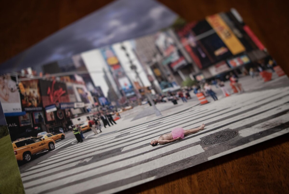 一個中年胖大叔,穿上粉紅色的芭蕾舞澎裙,在知名景點自拍,背景可能是時代廣場、可能是鄉野湖邊或者是一群芭蕾舞者。每個畫面裡的幽默、自嘲引人發噱。如果更深入探究這些照片背後的意涵,你會看到人類在廣闊無垠的自然環境裡,顯得渺小,甚至顯得孤寂與茫然。彷彿人在天地之間對抗命運、疾病時那股「人生有些關,你得自己過」的無奈與感傷,而那些情緒,悄悄被藏在畫面深處的角落裡,不被輕易發現。