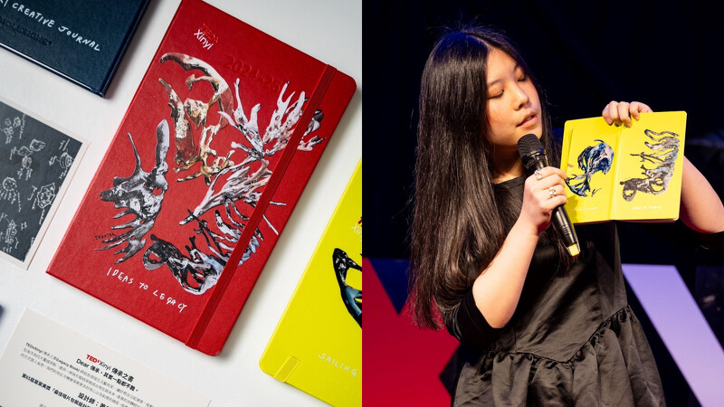 本身也是文具喜好者的蕭君恬,今年在TEDxXinyi策展人Dawn的邀請之下,親自操刀設計由義大利百年歷史筆記本Moleskine贊助、TEDxXinyi 2024年度大會限定的四款「傳承之書」,分別以上屆四位TEDxXinyi講者倡議的主題和金句延伸,包含「傳承之味」、「傳承之境」、以及「航海日誌」。蕭君恬以AI生成數位影像,花了三天的時間堆疊出連續的畫面,延展出遠超過平面紙本載體的立體概念:「數位是我更為熟練的方式,所以我想事情的時候會同時設想畫面呈現在各種媒材上的樣子,可能是專輯、筆記本,也可能是紐約市廣場的一個超大螢幕上,不會特別去定義或限制。」