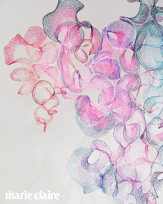 今年在台北當代展出的大型裝置《不定的粉紅》,貌似編織物,實際上用環氧樹脂接著,是以「粉紅」與「編織」兩種對女性的刻板印象來創作。「在20世紀,粉紅色更屬於男性的顏色,因為接近紅色,代表堅強、敵意。身為編織藝術家,我也常常被問為什麼女性用編織來創作,但當代藝術編織的男性其實也很多。」