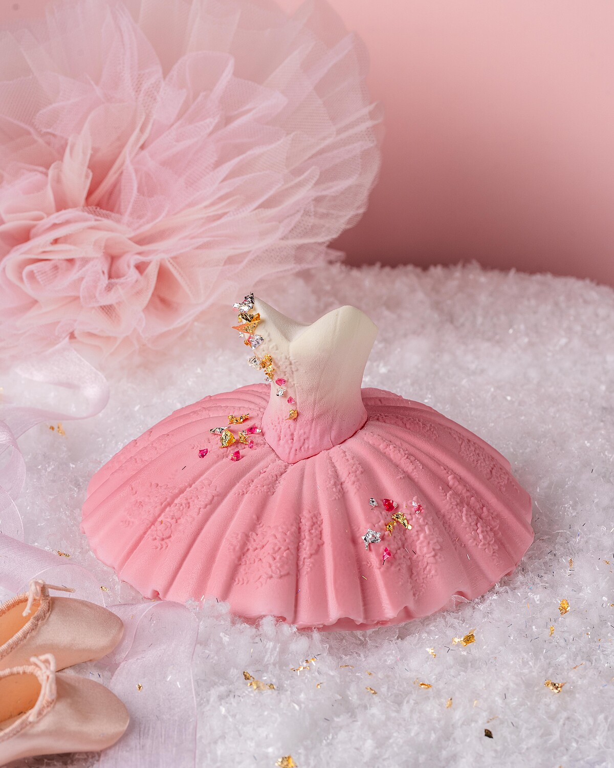 甜點主廚 Simon Letaillieur 將這一幕化為如精緻雕塑般的甜點之作。雕刻精細的白巧克力外層包覆四層風味,如首席女舞者的步伐般流暢交融。柑橘與香草慕斯如「entrechat」(芭蕾舞中兩腳騰躍交叉的動作)輕盈飄逸,玫瑰海綿蛋糕則展現「arabesque」(單腳站立,另一腿向後延伸)的優雅沈穩,開心果脆餅則如充滿張力的「grand jeté」大跳。