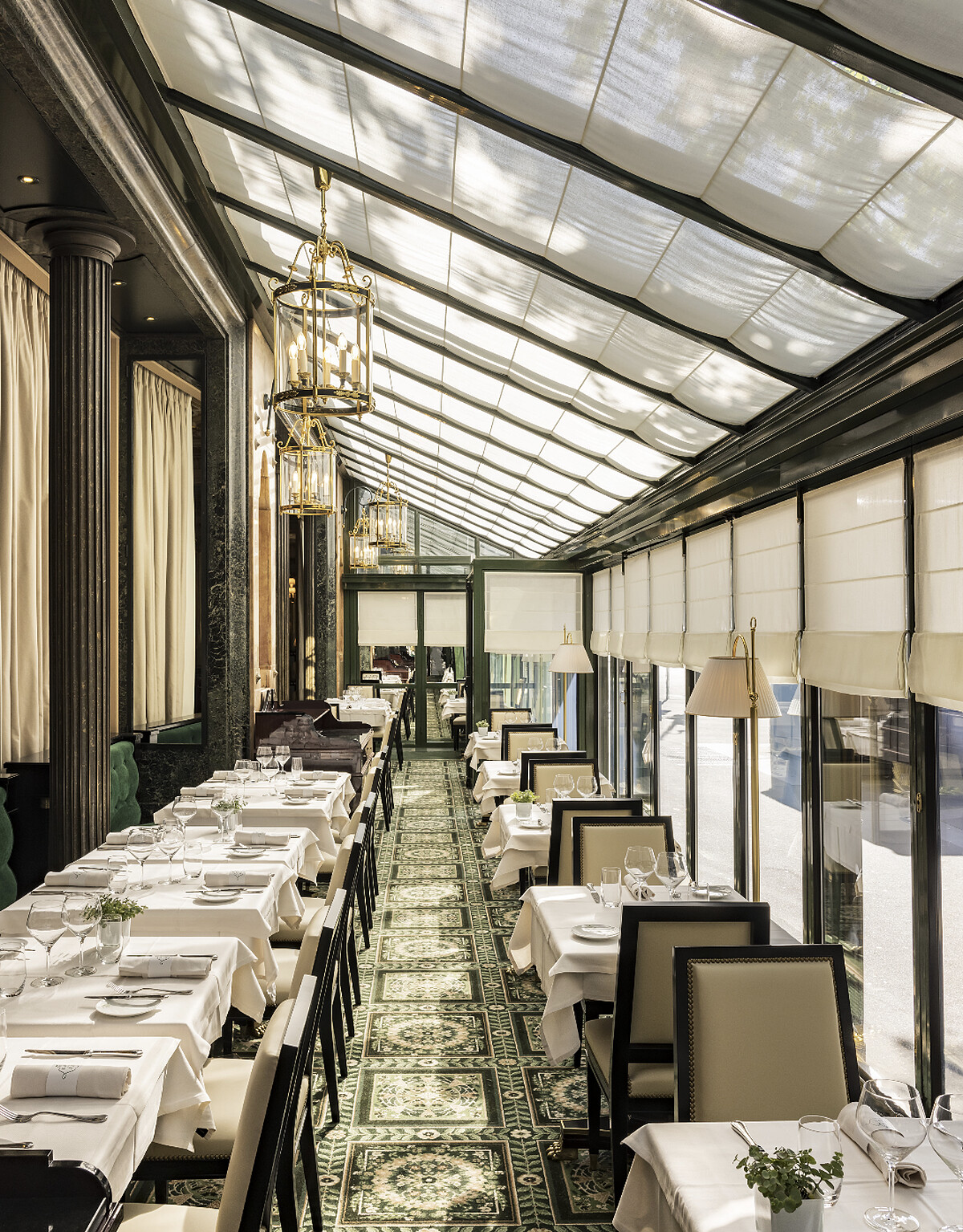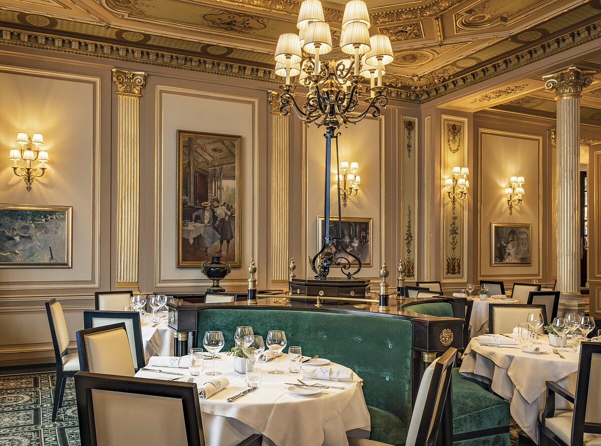 他以致敬「美好年代(Belle Époque)」為核心主軸,喚回空間的歷史戲劇性。如今,面向卡普辛大道(Boulevard des Capucines)那側,以仿天空彩繪的藻井天花板為視覺亮點,搭配金色、米色與綠色調材質,深色木質的扶手椅和綠色天鵝絨長椅相呼應,精密的燈光配置,既保留奢華,也增添一抹溫潤。