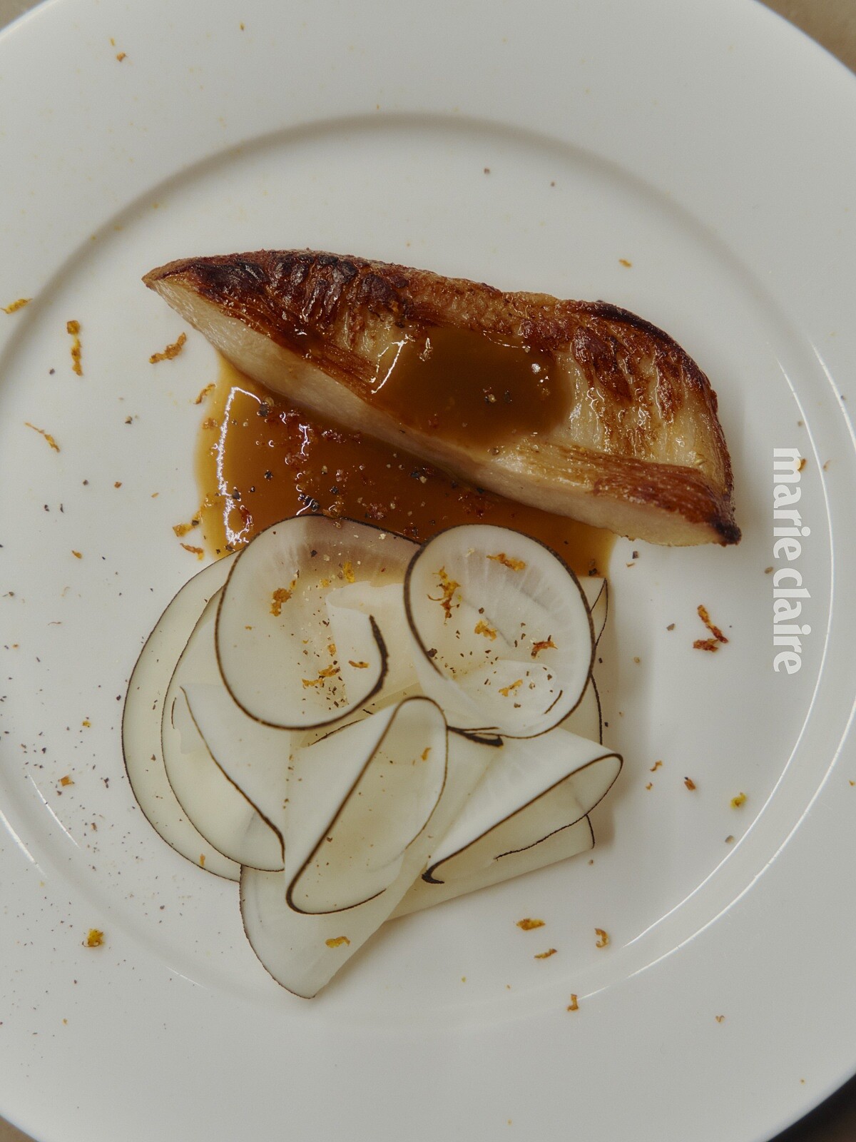 材料:蘋果 1 顆(青蘋果或蜜蘋果)、檸檬或柚子皮末(可省)、新鮮嫩薑末 ½ 茶匙 調味料:Ponzu 醬 2~3 湯匙、蜂蜜 1 茶匙(依甜度調整)、少許鹽、冷水 1~2 茶匙、太白粉 2 茶匙 醃漬黑蘿蔔沙拉 材料:醃漬黑蘿蔔薄片適量、血橙皮末(裝飾用)
