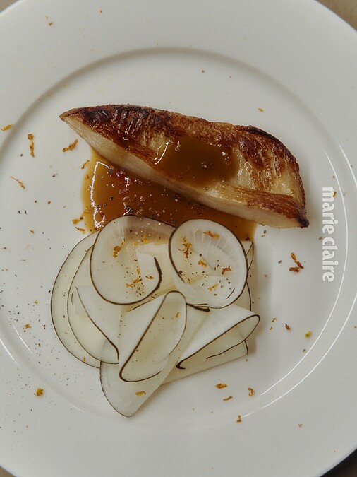 豬頸肉油脂豐厚,最適合搭配清爽酸度,過濾後的蘋果 Ponzu 能在不失層次的情況下平衡整體風味。
