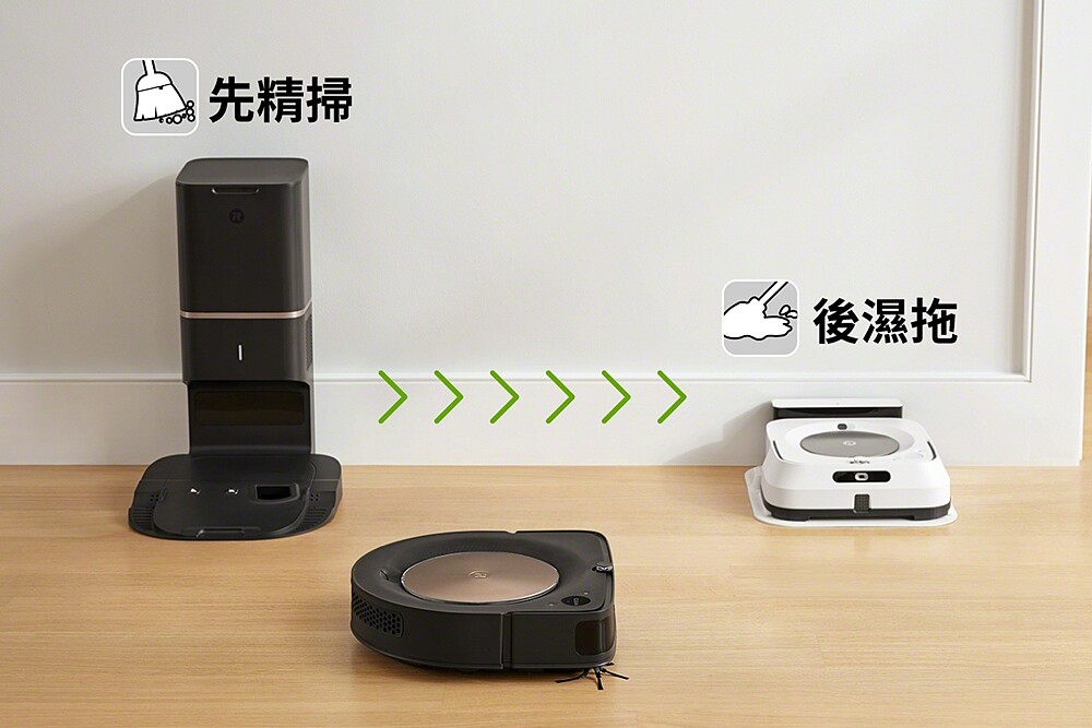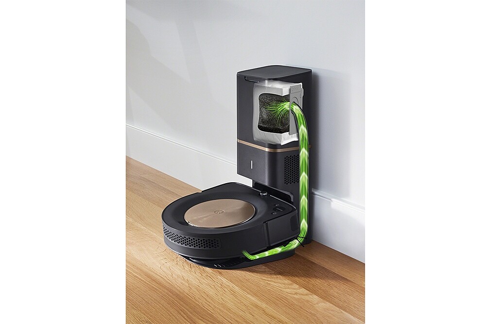 「Roomba s9+掃地機器人」同樣屬於品牌旗下的自動集塵系列,有著專利自動集塵座、內置「過敏原剋星」拋棄式密封集塵袋。只要清掃完畢回到機座時,會將垃圾以高效壓縮至集塵袋中,裝滿時會藉由閃爍紅燈、APP通知,此時拉起手把就能丟棄集塵袋,從吸塵到處理垃圾都不用弄髒手。掃地機器人的新版集塵盒容量也增加38%容量,可容納更多碎屑,事後也能用水洗清潔。