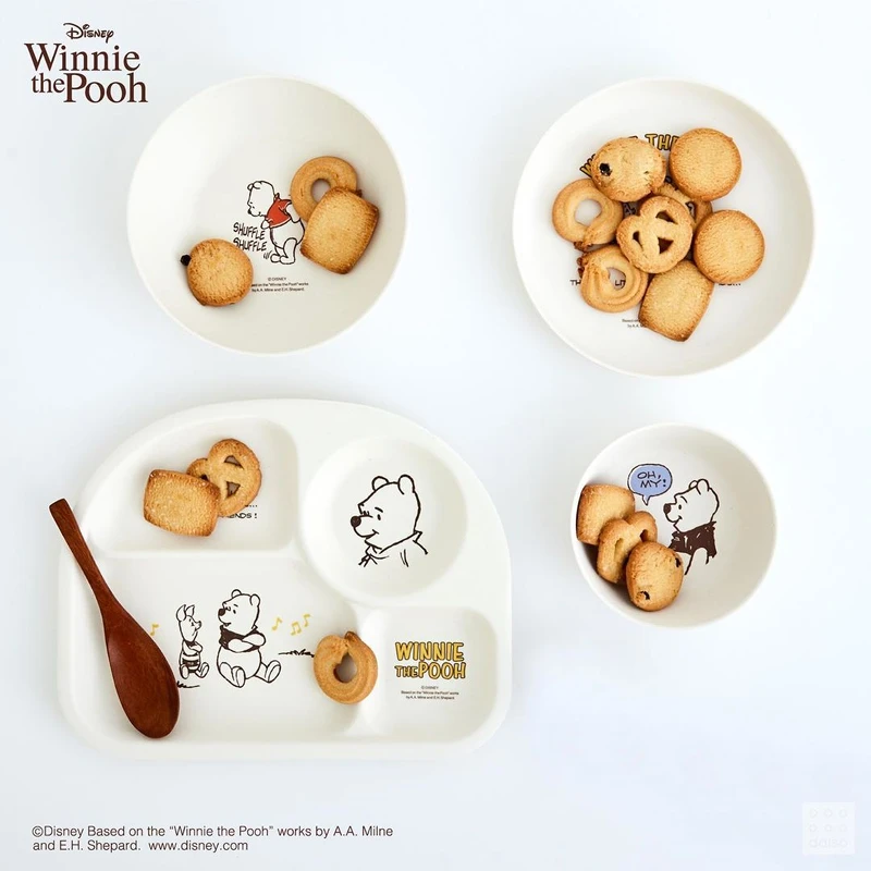 這系列的餐盤組合以維尼經典圖案發想設計,搭配白底清新風格,當作下午茶小碟超適合!