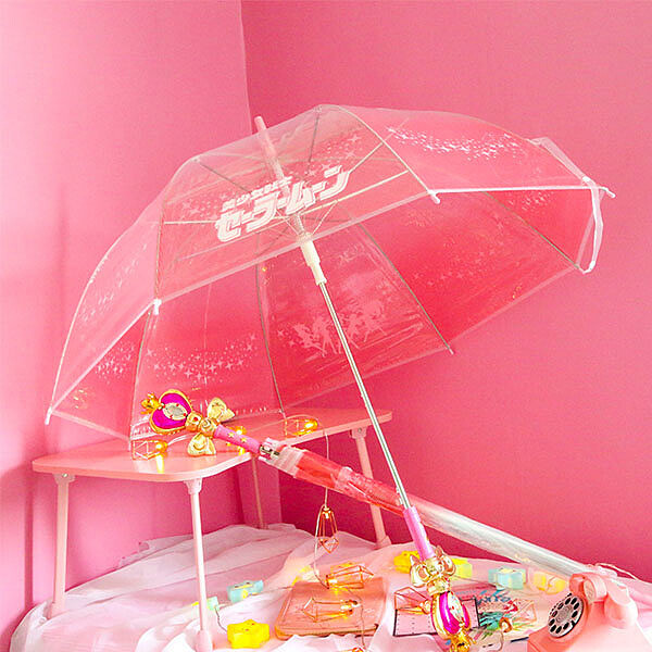 而傘面則是搭配天空藍、桃紅色的透明雨傘,上面印滿了月光萬花筒魔杖的圖案彷彿萬花筒一般,實在太可愛了,絕對能代替月亮逞罰下雨天,連路人看到心情也會跟著好起來!
