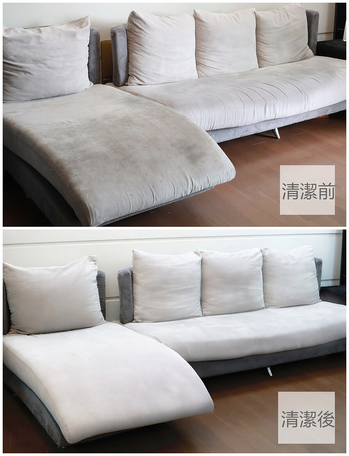 原本小孩經常在上面吃東西、已經開始有點泛黑的灰色布沙發,經過除塵蟎清潔後,居然恢復了原有的顏色。