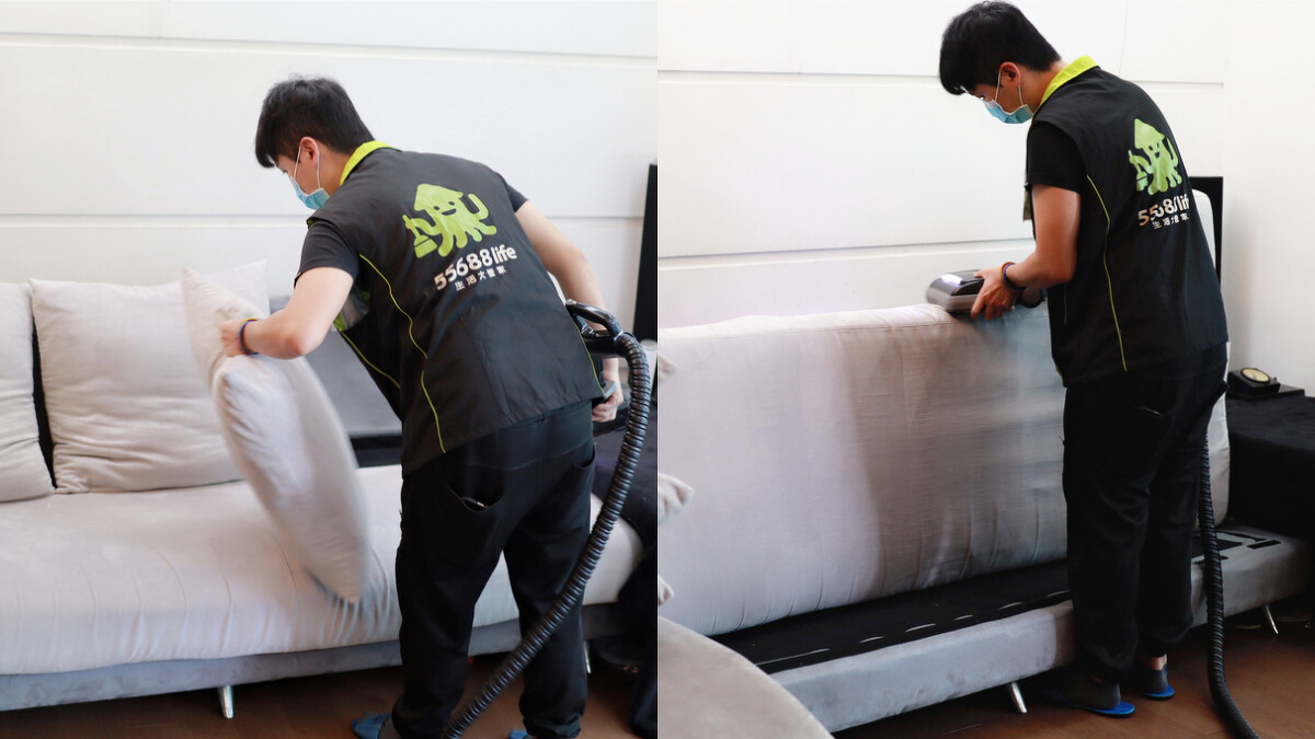 這次她預約的是「生活大管家」的清潔服務。穿著制服背心的師傅,進入家中後,會換上自備的乾淨拖鞋,然後就開始利用「水過濾吸塵器」+「高速拍打吸頭」,有步驟地徹底清潔沙發每個角落!