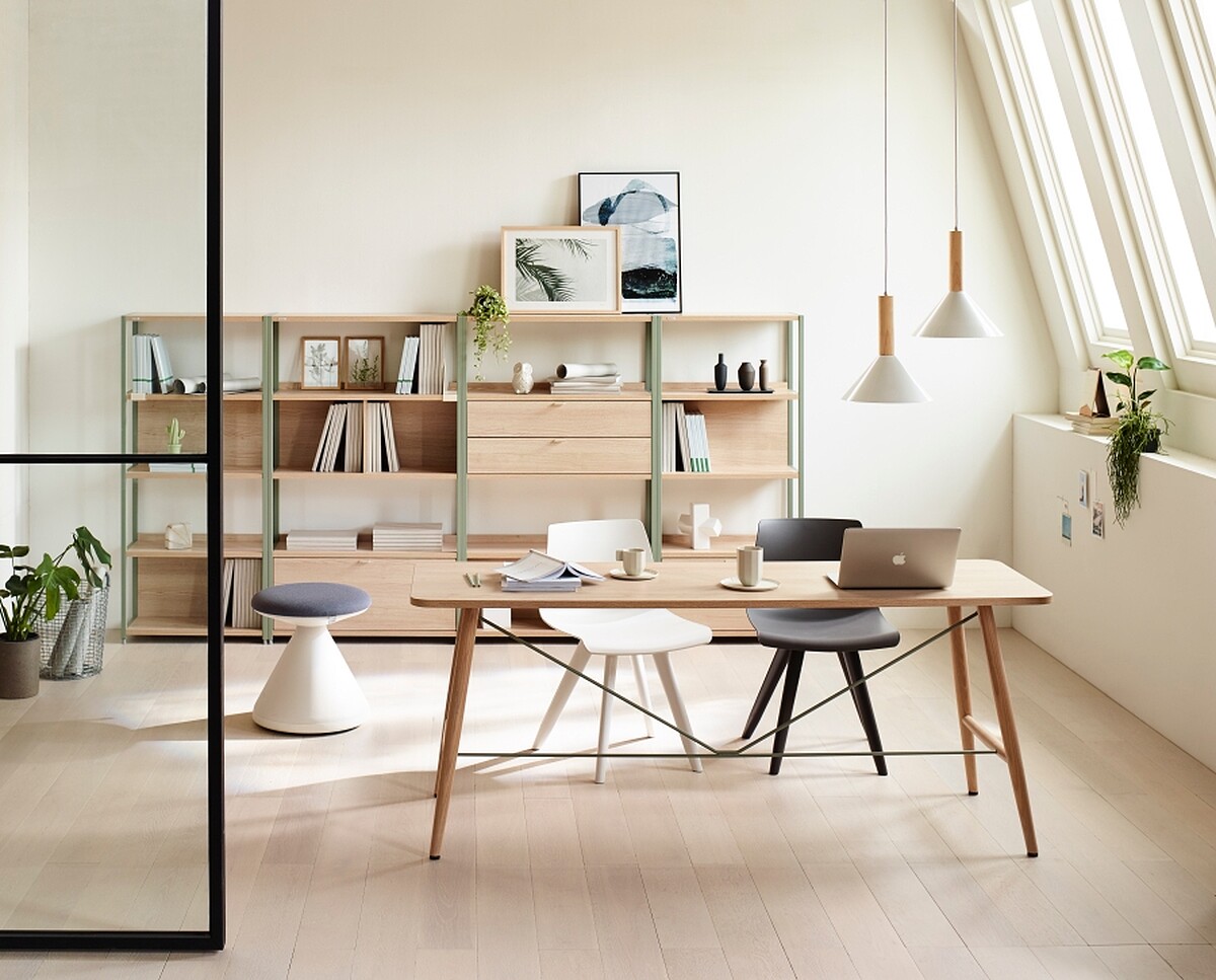 由冷色調金屬與溫暖木頭組成的堅固層架,並以簡約設計線條設計。可以將不同型號的層架以配件結合,讓空間利用達到最大化。