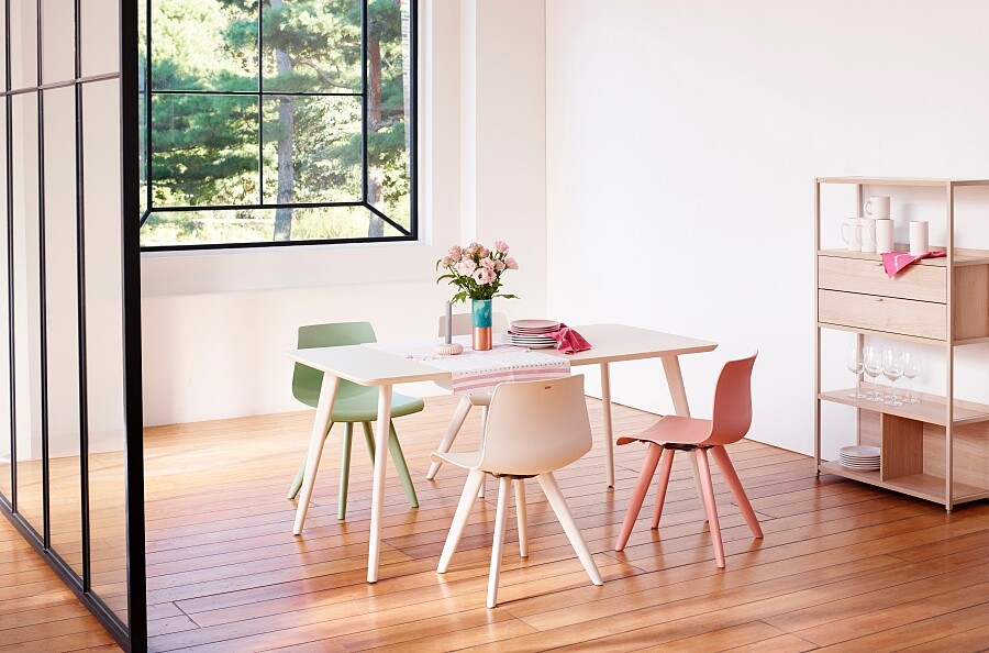 具有曲線之美的「Seta-plus 經典椅」,背座板則採用柔性塑料製作,擁有靈活彈力能舒適移動;水柱型座椅設計能減輕大腿負擔;有著底部托盤裝飾的原木椅腳,呈現堅固質感、防止噪音及對地板的損壞。有四種顏色選擇。