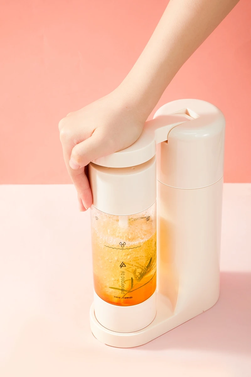 全新的迷你尺寸容量約為500ml,不需要插電、裝電池,只需要簡單安裝氣瓶、加入想喝的飲品、直接按壓式打氣,就能將水、果汁、汽水、酒精飲料輕鬆注入氣泡。若是製作含糖飲料氣泡飲,建議先打開第一段洩氣,待聽到常常洩氣聲後,靜置1~2分鐘後便可以打開飲用。事後也能將整個杯體拿去水龍頭下沖洗,不怕含糖飲料殘留。