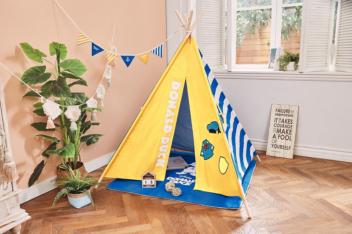 不能錯過的唐老鴨帳篷組,耐洗耐用適合幼童使用,內含純棉帆布帳與地墊、可拆式二節木桿、塑膠銜接環、佈置用小旗幟,在家也能營造露營風!