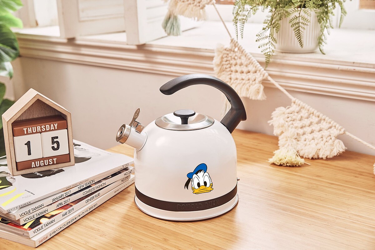 唐老鴨氣噗噗笛音壺,採用304不銹鋼材質,外層琺瑯釉料塗層堅固耐蝕,按壓式響笛提示功能讓煮水也能很放心!
