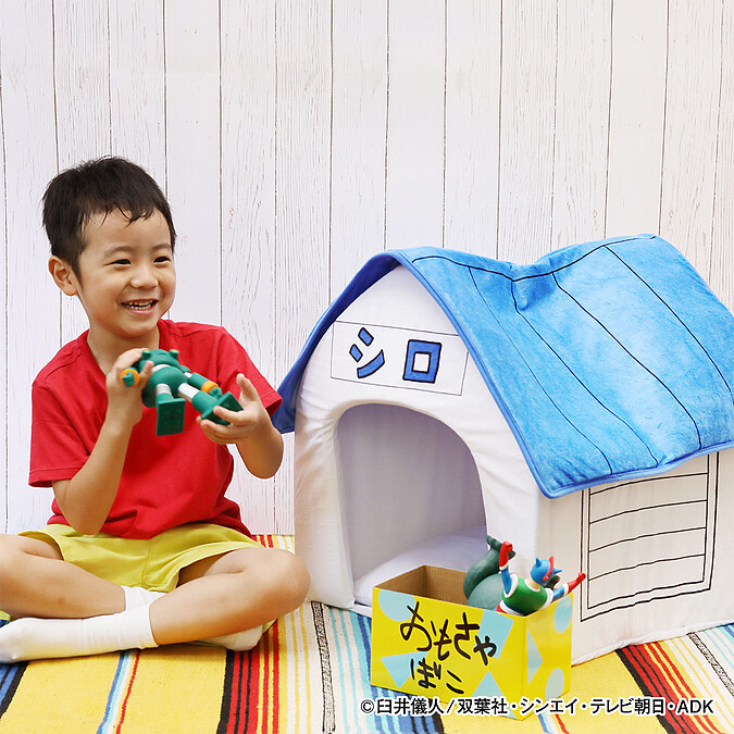 這次將小新最好的朋友小白的家實體化了,神還原白色小屋與藍色的屋頂,以親膚地絨毛材質製成,不只可以當作收納空間,同時也可以是小孩們的秘密基地,甚至可以是家中毛小孩的寵物窩,實用度滿分!