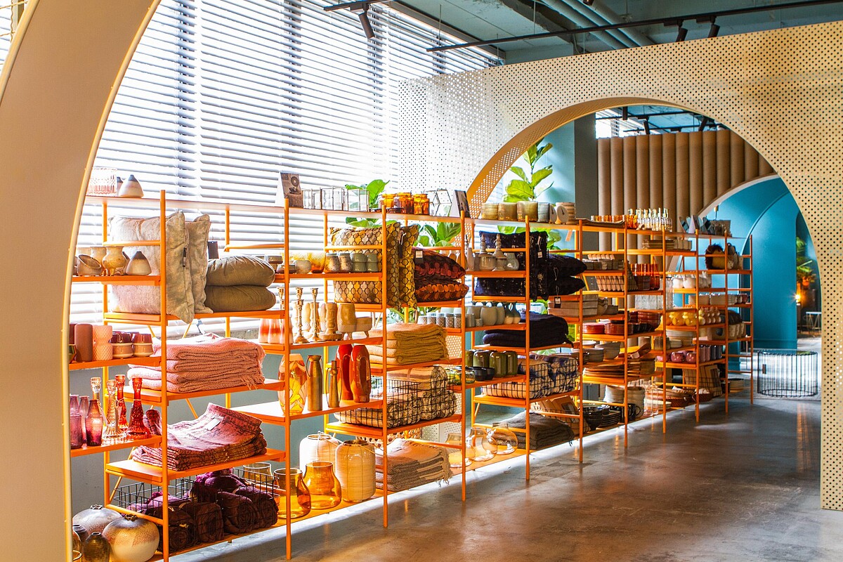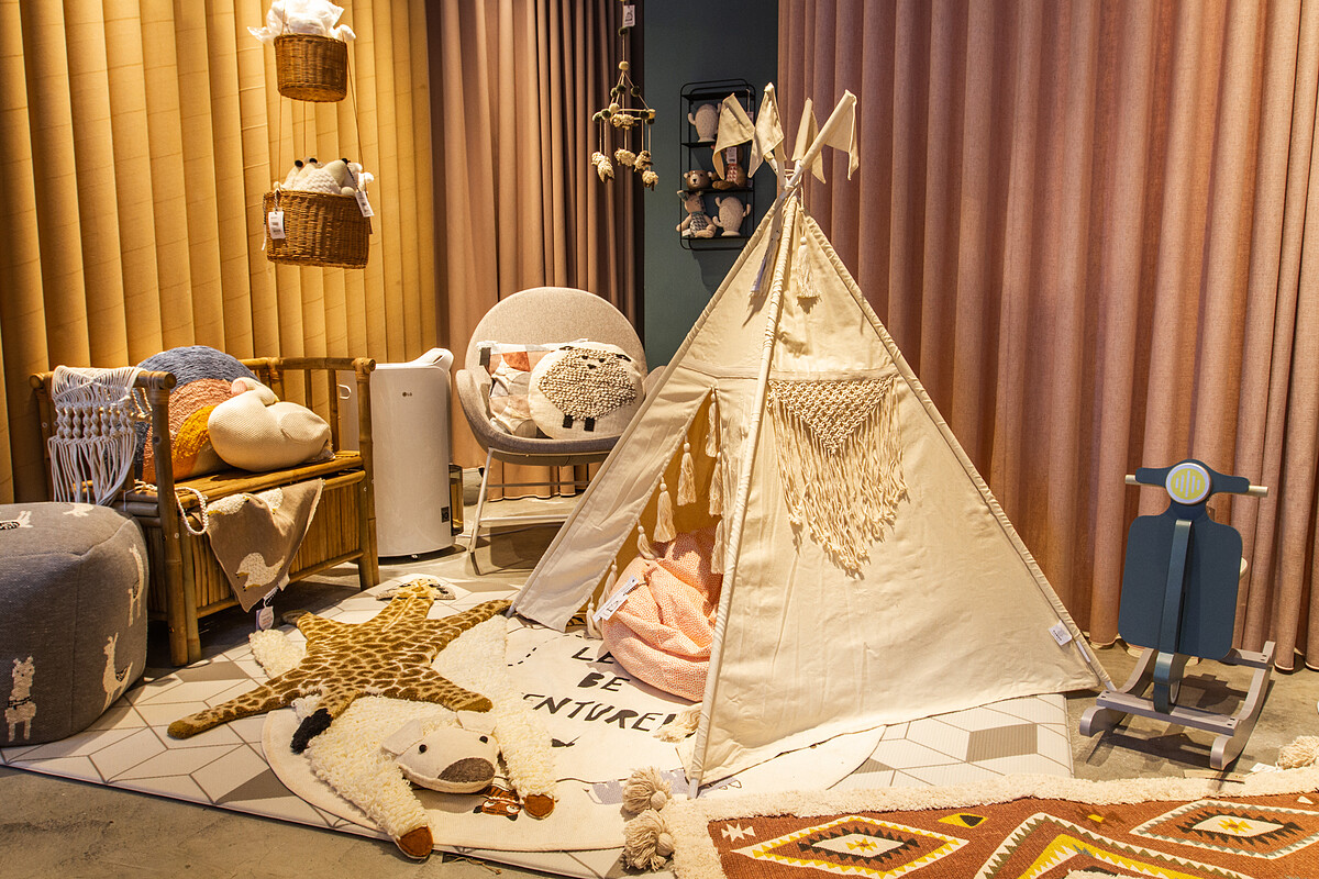 超越選物店,剛開始走入就像逛進歐洲市集般目不暇給心而有點興奮慌。除了不定期花藝美食活動。現場主題性劃分為前方「美味市集」進口美食乾貨;中心地帶展示獨家代理丹麥Bloomingville文青風格傢俱家飾,層架區有各式歐陸餐桌床寢用品和mini兒童系列展示區;最深處則有質感雍容的荷蘭Zuvier與Dutchbone 設計家居家飾。