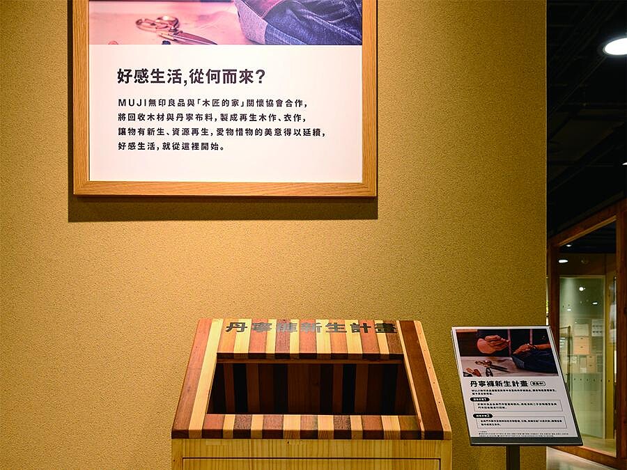 仔細觀察台中人生活後,MUJI無印良品發現台中人喜歡野餐、與親朋好友分享生活大小事,因此特別攜手「木匠的家」關懷協會開發如可提野餐小桌、跳房子地墊、木屋小帳等相關商品,也都是由回收木材及二手丹寧布料製成,為舊物賦予新生命。門市外更設置丹寧褲回收箱,邀請大家一起捐出不再穿的褲款。