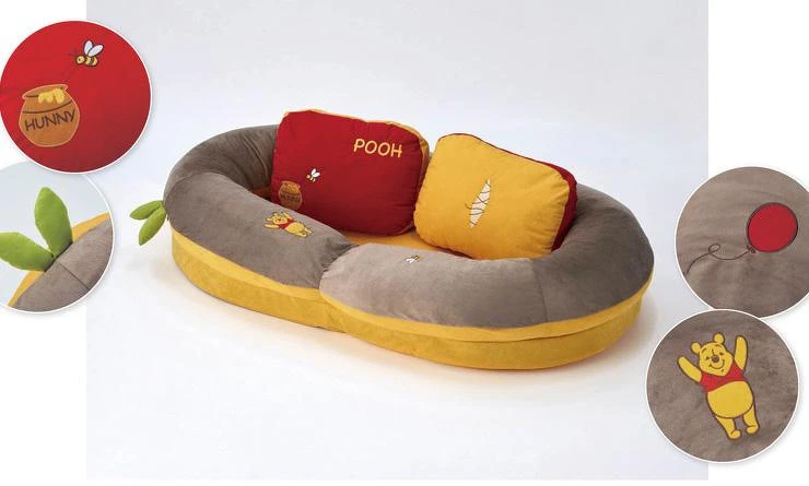 外觀以小熊維尼的招牌黃色、紅色,再搭配咖啡色的配色,沙發上還有精緻的維尼刺繡、蜂蜜罐,最讓人驚喜的是一旁還有立體的小葉子,打造出舒適的慵懶感。