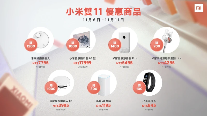 即刻起至11/11止,「小米雙11超級購物節」已吸引眾多米粉們搶購,10月下旬才開賣的「小米智慧顯示器 65型」立刻現省1000元;空氣淨化器、掃拖機器人也都降價1000~1400元,可說是相當有誠意。