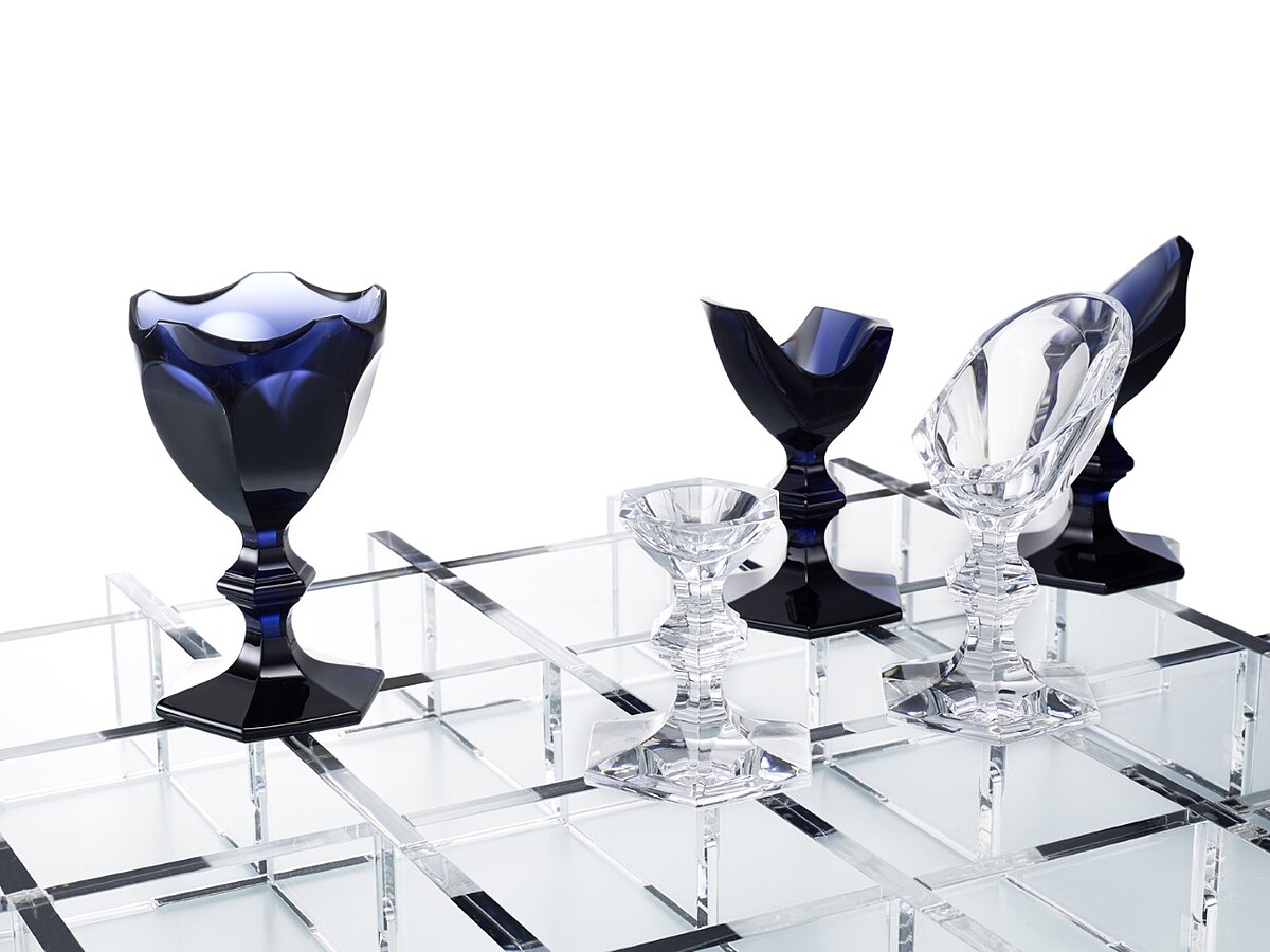 另一款「Nendo哈寇特西洋棋」則是與日本新銳設計集團Nendo合作,重新以BACCARAT最經典哈寇特三號酒杯汲取靈感,賦予精緻細密的切割塑型而成各16件透明水晶與午夜藍水晶酒杯棋具,整件作品須要100小時手工打磨,以及BACCARAT專業工匠花費40小時的切割。