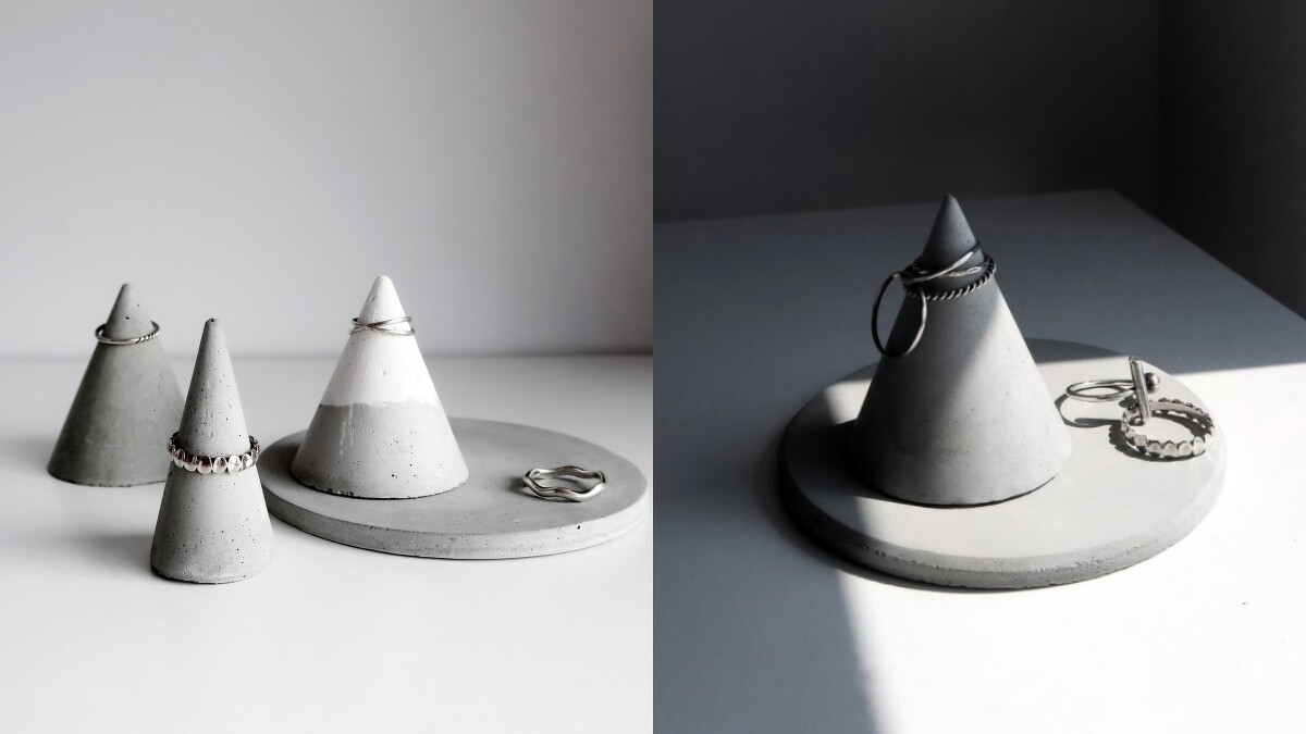 戒指耳環等小配件太多、要戴總找不到?新的一年就先把這戒指座備好吧!用雙色水泥製作成3款小尖山、小山雪與小山霧的戒指座,表面還有斑駁的紋理與孔洞,像極了自然地質樣貌。還能滴上喜歡的精油達到擴香效果。