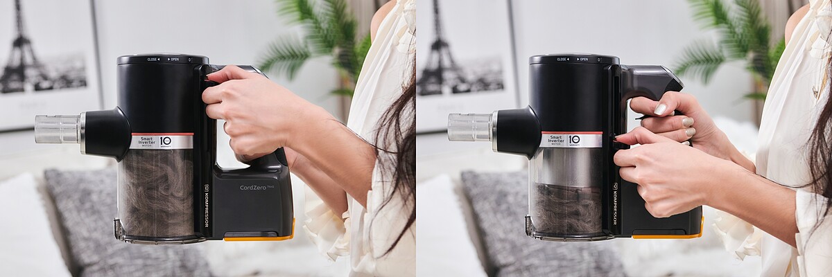 另外讓媽咪速玲大推LG A9K系列 WIFI濕拖無線吸塵器「集塵壓縮」功能也是很貼心的新設計,比清理一般吸塵器的集塵盒更為方便,在髒汙灰塵被吸滿後會因為壓縮設計而讓灰塵量變少,集塵盒容量因此增加減少常常清理的繁瑣性,加上傾倒時只要輕輕一按就搞定,輕巧乾淨又不沾手,減少以前光是在清理集塵盒垃圾時,還要擔憂避免過程中再滋生一波灰塵來襲的痛苦。