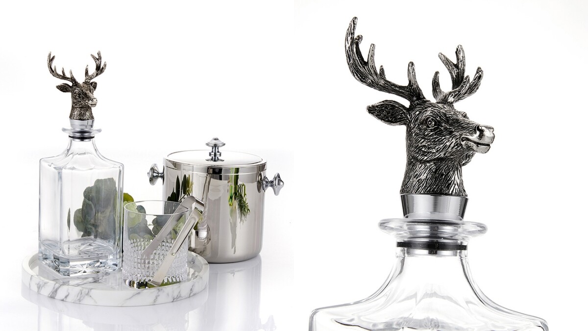 由Finara費納拉國際精品家飾推出,讓濃烈的威士忌時刻更添質感與「野性」!精緻醒目的公鹿造型酒塞,配上玻璃酒瓶、玻璃杯,勢必引起社群上的高度關注。博客來上還找得到鍍銀「鴨公爵」倒酒瓶,注重生活品質的酒鬼們,可以考慮入手收藏。