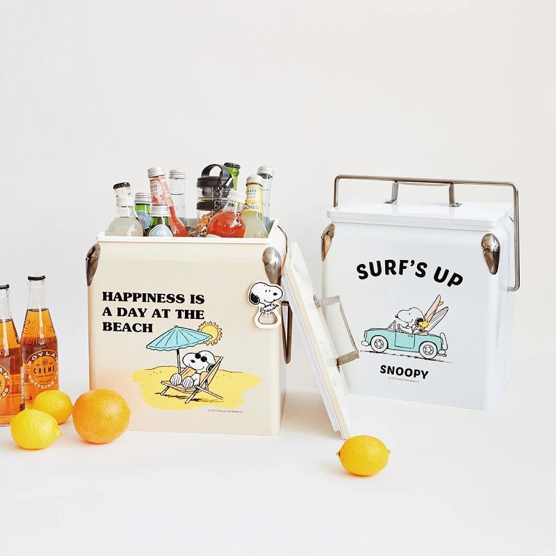 外出野餐或露營絕對必買保冷箱,簡約的設計搭配兩款不同顏色,上面印著準備出發度假的Snoopy,整體時髦又可愛!