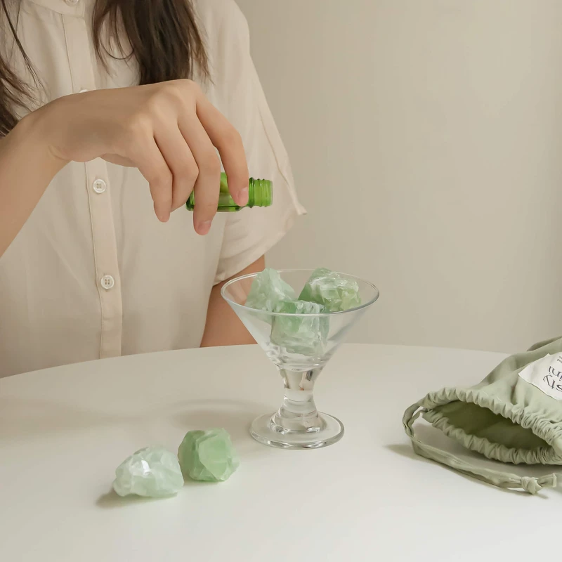 近期很流行的水晶石在這裡也能夠買到!整組包含了清透的綠晶石、迷你馬丁尼點心杯與品牌小收納袋等。可以在晶石滴上喜愛的精油成為擴香石,只要使用清水洗滌及擦拭後就可以重複使用,也可以變化香味。