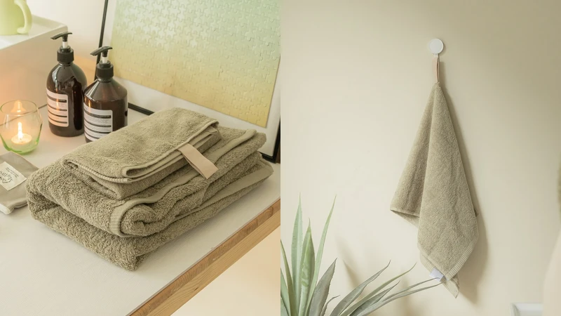 這款綠色毛巾選用飯店級厚磅數製作,並在掛勾處巧妙地使用杏輝撞色增加質感。讓日常的小角落都充滿儀式感!
