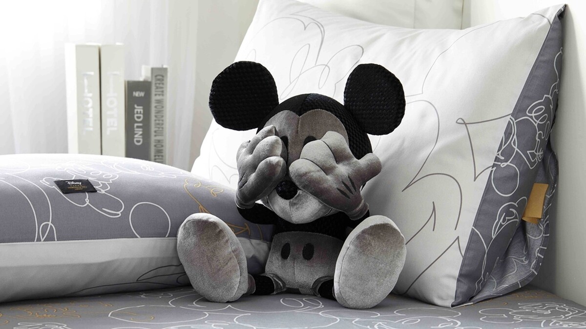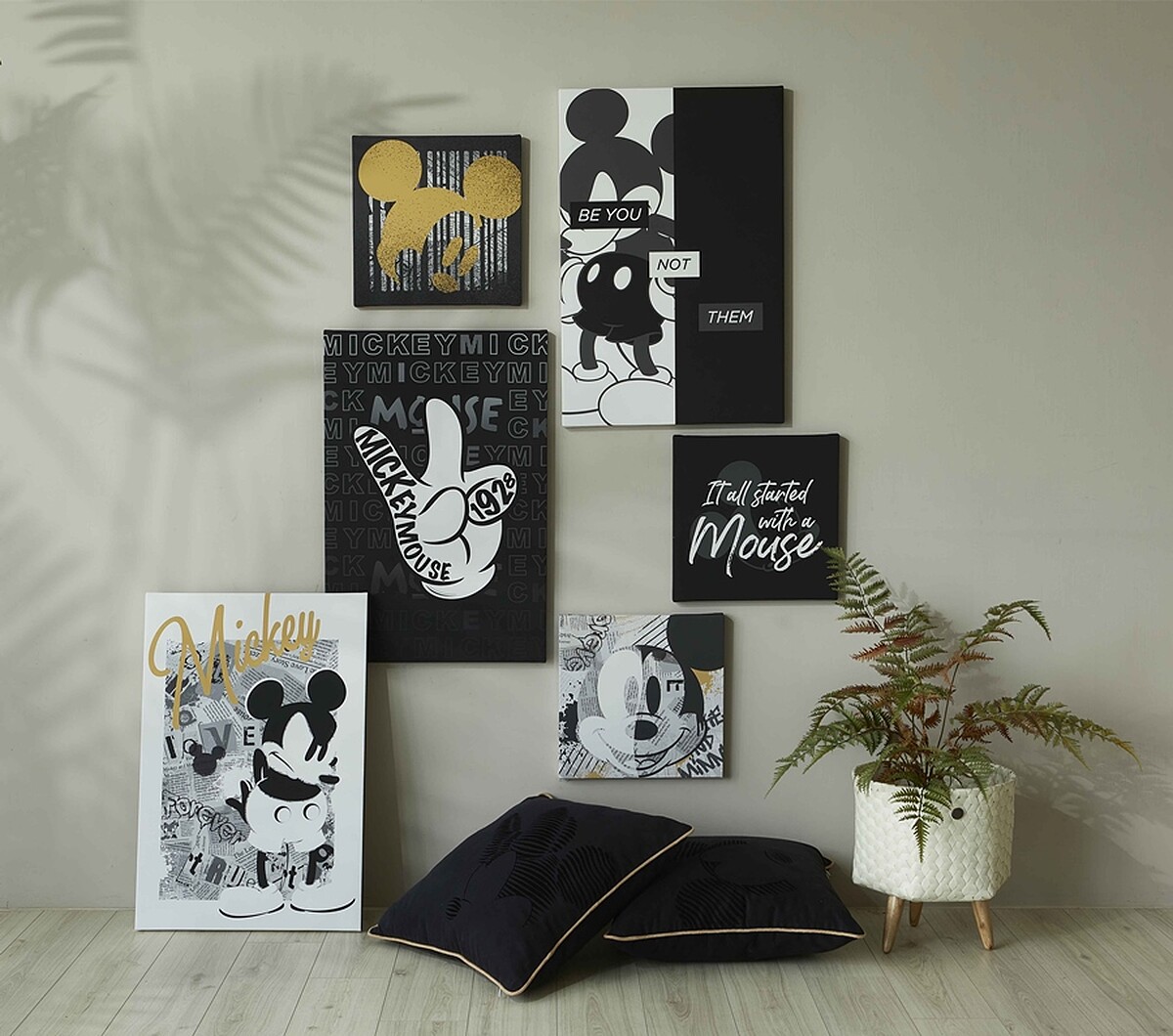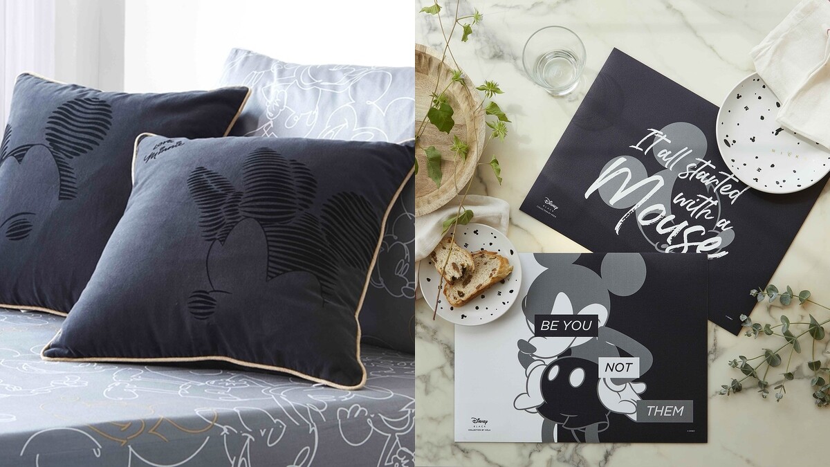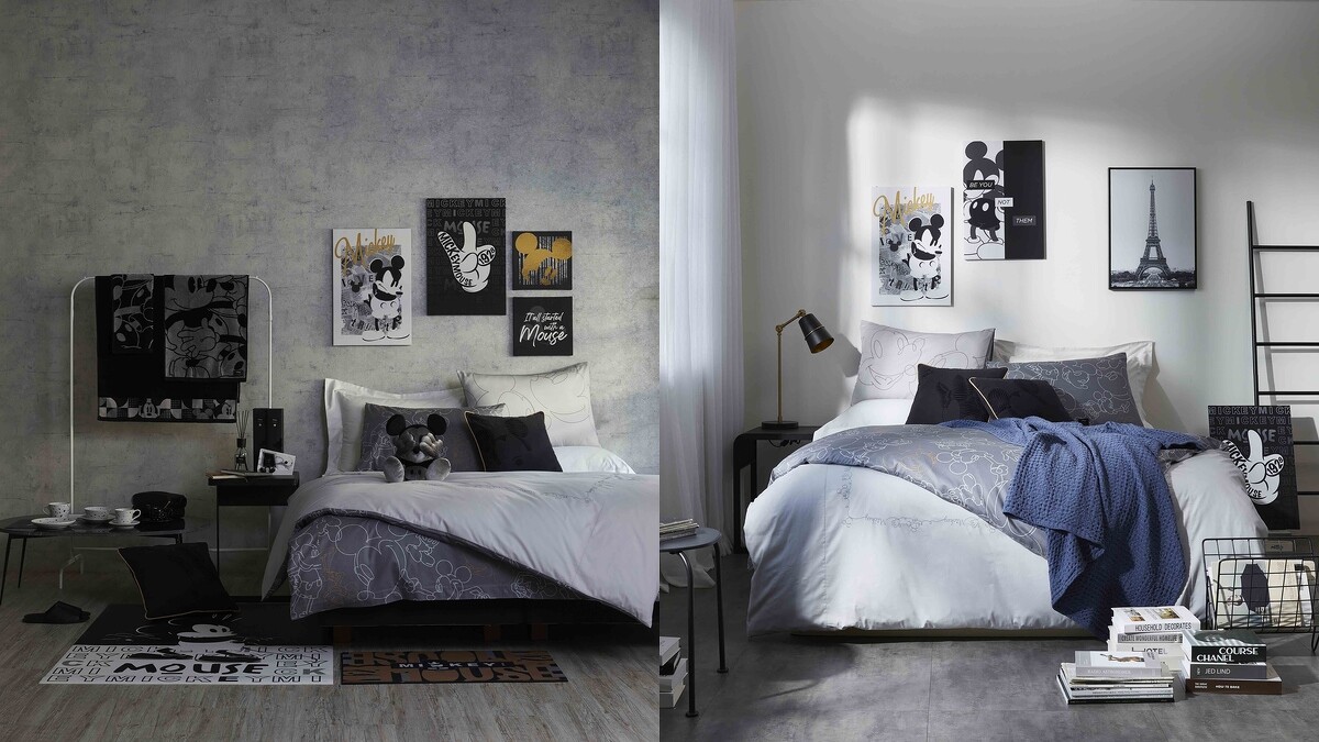 另外懶骨頭、抱枕都採用異材質拼接;真皮面紙盒、室內拖鞋及餐具組,都能看到米奇耳朵、圖案與英文字等經典元素。床被組的細節中也能看到精緻的刺線條;無框畫則以黑、白、金三色營造出摩登藝術風格,並充滿街頭、對比感。這個秋冬,就用「HOLA x Disney Black系列」為居家換上嶄新面貌吧!