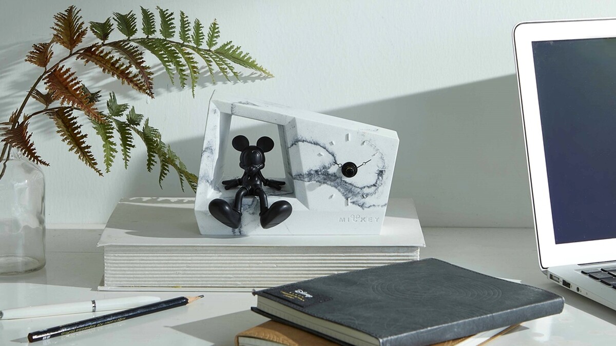 此次聯名共推出16項商品,全新品項為加入環保材料的「再生大理石米奇時鐘」,有著3D米奇、每台皆不同的大理石紋路,擺放在家中或辦公室都能立刻點亮空間。每檔都有的玩偶,則採用「電子絲絨」材質,讓害羞摀著臉的米奇能散發出迷人光澤。