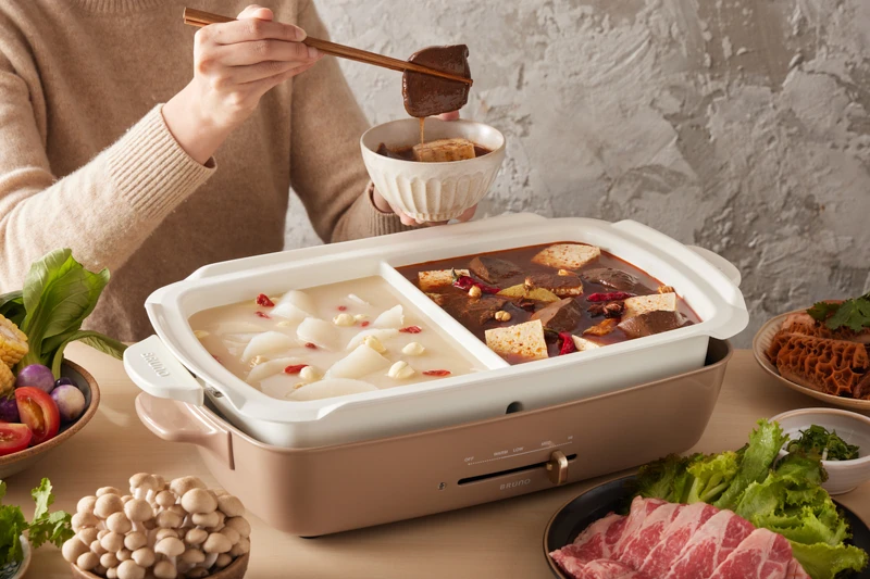 吃鴛鴦鍋必備的鴛鴦鍋也比以往多出1倍的容量,從2L增加到4L讓每個人在家都可以完美呈現自煮鴛鴦火鍋,BRUNO歡聚款大電烤盤絕對可以滿足各類型社交團聚的料理需求!