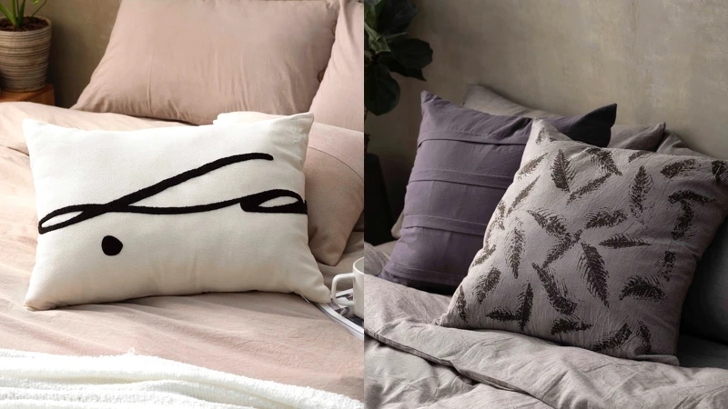 寢具與抱枕嚴選親膚水洗棉與棉麻材質,床包、抱枕、披毯都有濃厚的秋冬紋理質感,搭配樹葉拓印、漸層、打褶與拼接設計,為居家空間增添細膩優雅質感,加上灰棕、米白色調,能緩解你我累積一整天的疲憊壓力,期望能藉此達到「好好睡覺」的想望。