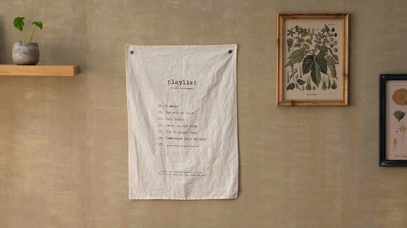 從早晨喚醒身心使用的馬克杯到餐具組合,使用增添手感的啞光釉面材質,不規則的邊緣傳遞出自然原始手作感。免釘牆的「Playlist風格掛布」則以棉麻交織出樸質風格,不防隨著上面的歌曲展開一段舒心時光。