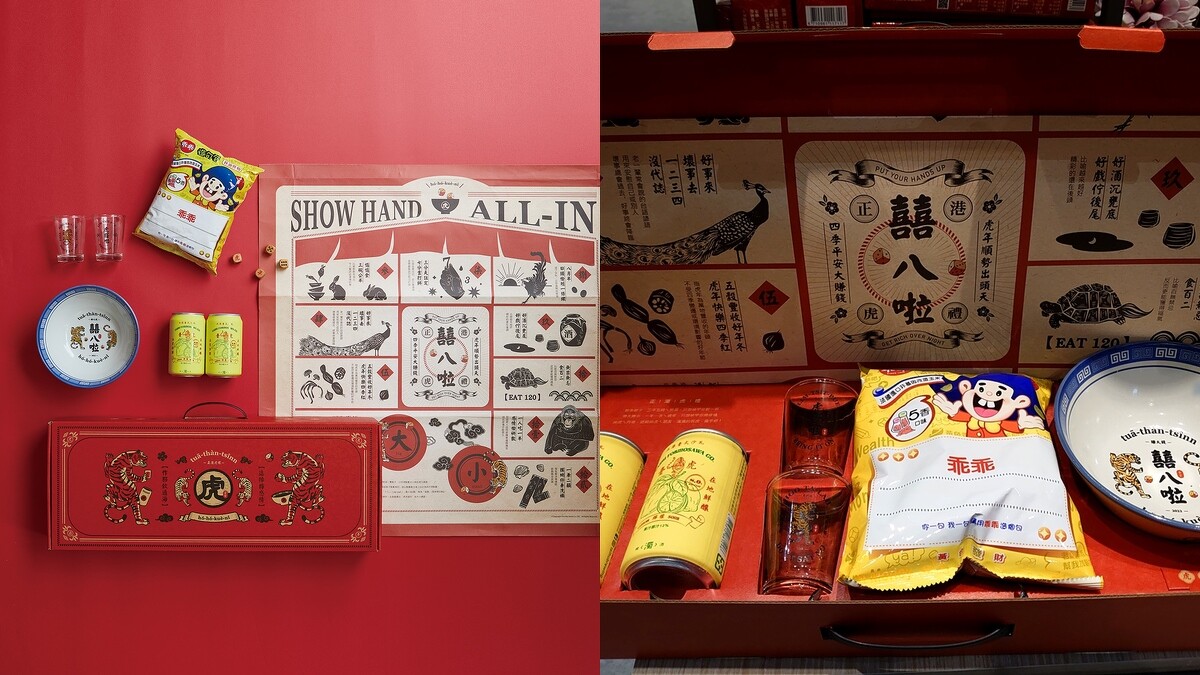 過年不想出門走春的話,不如跟親戚一起玩場台式桌遊重溫美好回憶!HOLA今年推出獨家設計的「正港虎禮囍八啦台式禮盒」,內附遊戲紙、骰子、碗公、臺虎精釀啤酒2入、乖乖五香口味1包、酒杯2入,有得吃有得玩勢必賓主盡歡。
