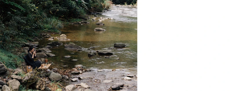 露營經驗已經十年的他,身手俐落地將打包好的道具搬移至溪流邊,熟練的展開桌子、組合椅子,再舀上一壺水泡起咖啡。道具一字排開盡是黑色、金屬、大地色系,而每樣器物造型相當鮮明有個性,隨後他優雅的轉身伸手折下岸邊一只綠色,插進案前的花器中,毫不費力又隨性的完成擺設。近年為了讓自己靜下心來,他開始學茶,透過一週一次的上課調適生活的節奏,在兩個小時裡專心的泡一壺茶,放下手機與世界隔離,讓身體與心靈都能歸位重置。近期更刻意將露營次數減少,讓等待的時間拉長好增加對再次出發的期待。
