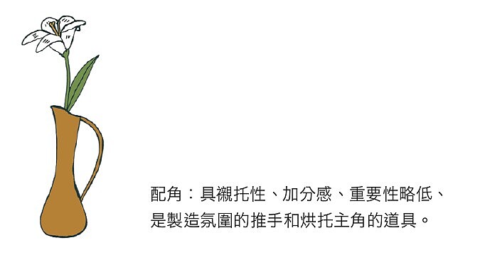 如何挑選適合的道具,端看主角與配角之間延伸發展出的關聯性。例如提到裁縫機就會聯想到訂製服飾、製作服裝的師傅、手工製作以及關於縫紉時會出現的物件;看見玫瑰花容易聯想到情人節;而康乃馨就會讓人想起母親節。配角的選擇除了烘托主題以外,用於居家環境的家飾搭配,就會具有點綴的特性,並不會非常繁複雜多。