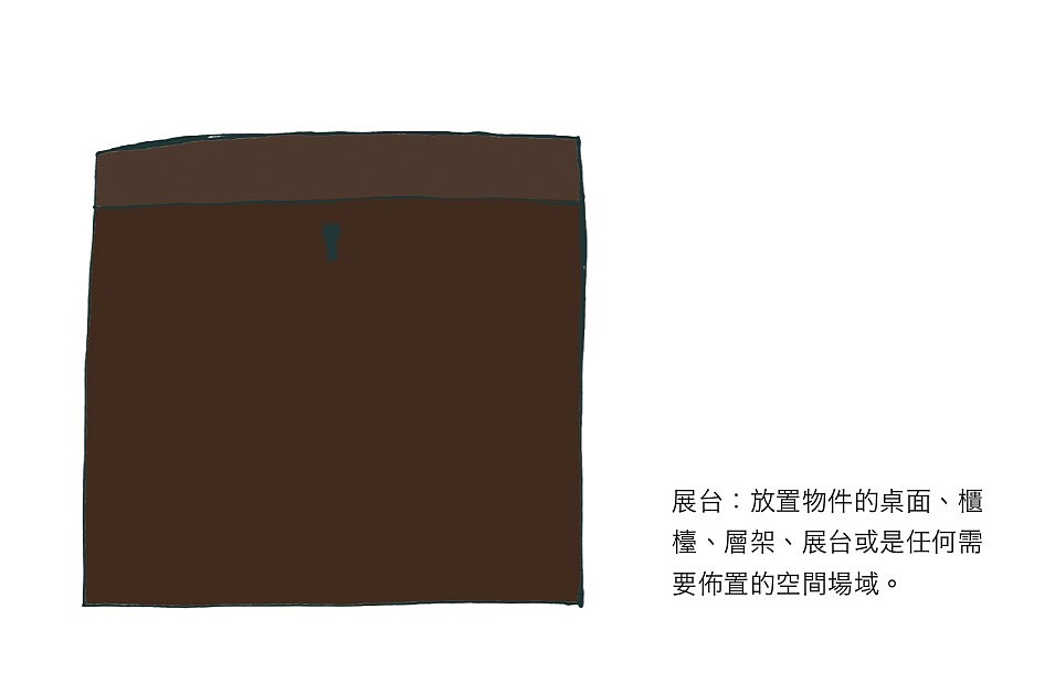 這裡所提到的展台,意思是指擺放物件的桌面、地面、檯面或任何表面,例如杯子擺在桌子上(水平空間)、畫作或掛鏡釘在牆壁上(垂直空間),意指物件的存在空間。所謂的展台就像是表現主角的場域,會在一定的範圍內,有創造空間感的特性,例如書房的佈置,在地面放上一片地毯,而地毯會製造空間中的場域感,形成目光注意的中心。展台是製造區域性、承載物件的三維空間,不限於任何地方,可以依照內心想像的範圍而成立,居家空間中如書房書架、客廳茶几、餐廳餐桌和臥室床頭櫃,都可以有擺放物件的設計。