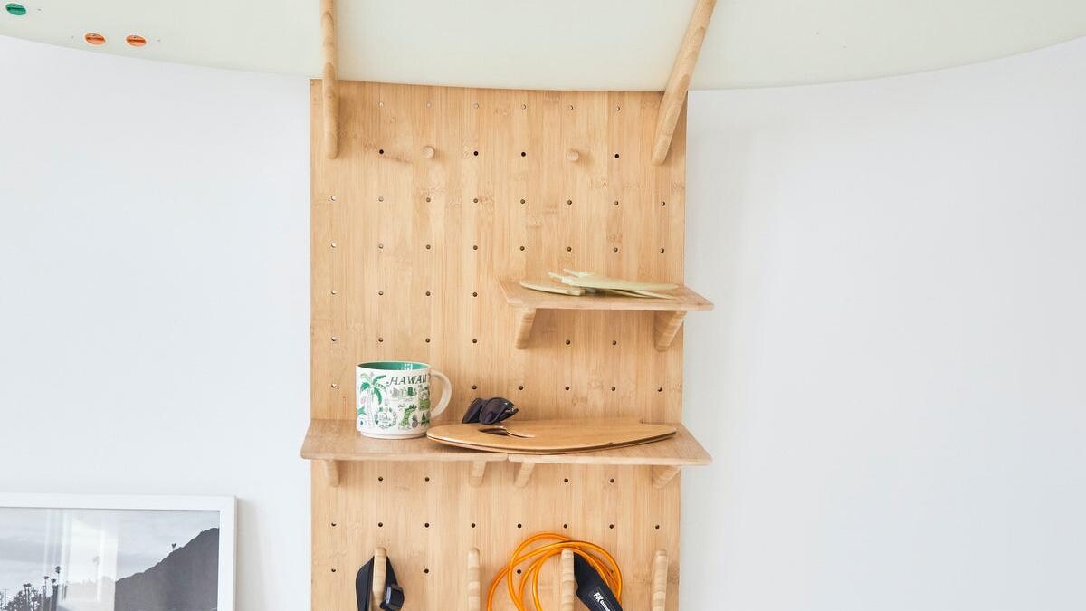 IKEA收納神器再升級!外觀造型以衝浪板架為設計靈感,採用天然竹製材質,搭配把手、層板、掛鉤和支撐架等功能,能整齊收納所有日常生活小物。