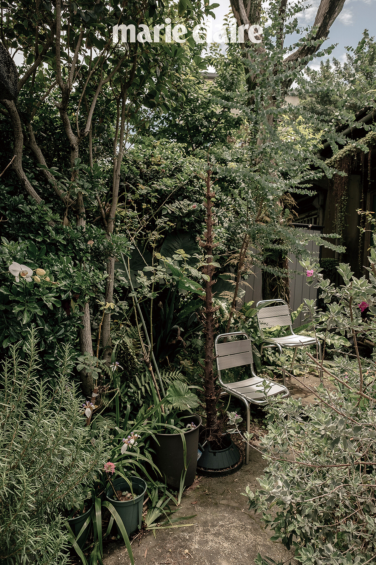 這裡最大的不同即是庭院空間,植栽們狂野不羈的生長其實是設定中的模樣,在熱愛下廚的女主人 Nora 催生下,種了許多可以料理入菜的香草植物,還有她從麻豆老家帶來的文旦樹,原先就生長在這裡的姑婆芋、蕨類、桂花等只稍做簡單疏理;也因為這個庭院空間讓過去害怕昆蟲的孩子們,現在會開心地和連成一條線的螞蟻去探險,聽到要吃炸豬排即自動自發的到庭園中摘下紫蘇一同上桌搭配。